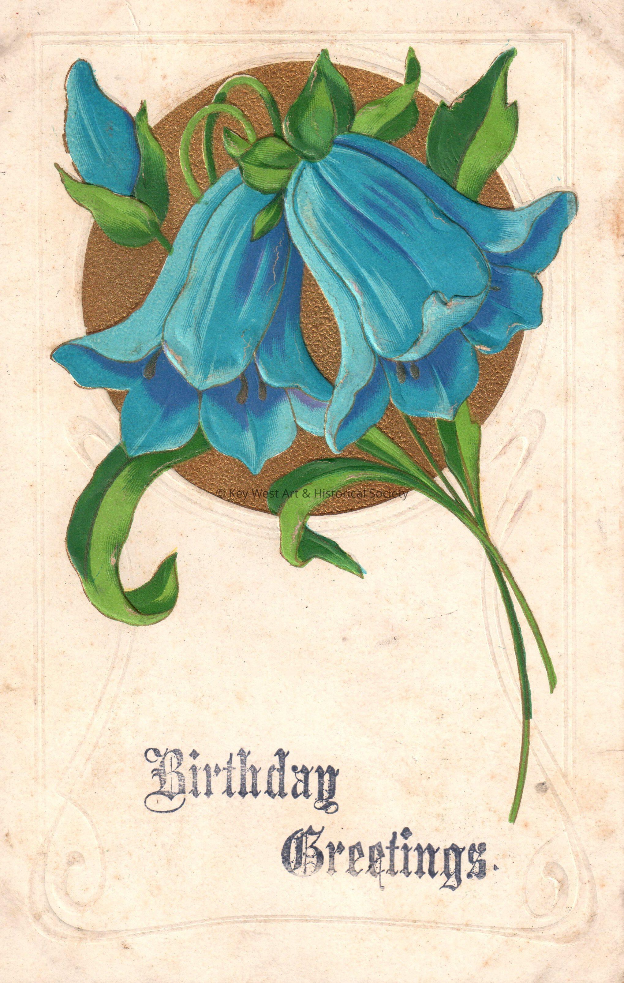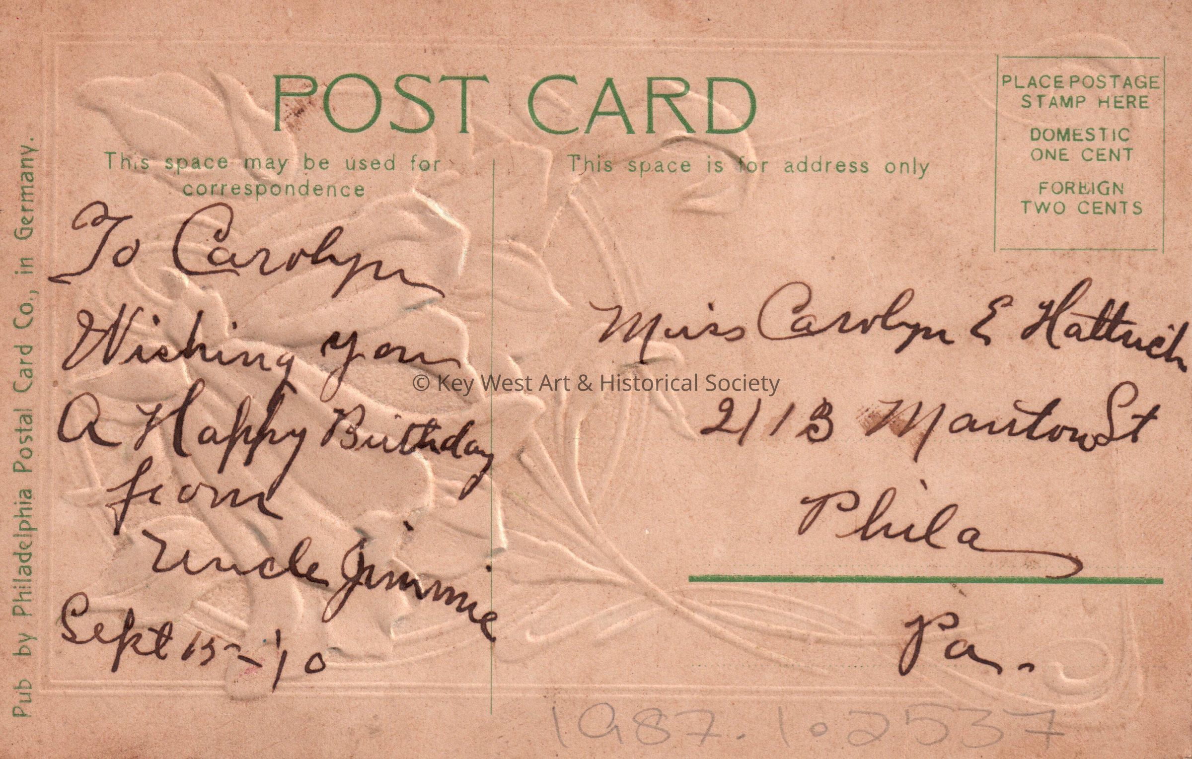Postcard depicting flowers. The caption reads, ‘Birthday Greetings’. The message on the verso reads, ‘To Carolyn, Wishing you a happy birthday, from Uncle Jimmie, September 15, 1910’. The card is addressed to Miss Carolyn E. Hattrick, 2113 Manton Street, Philadelphia, Pennsylvania.Collection