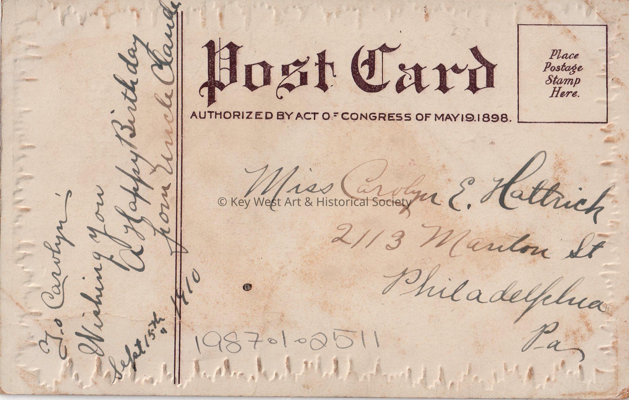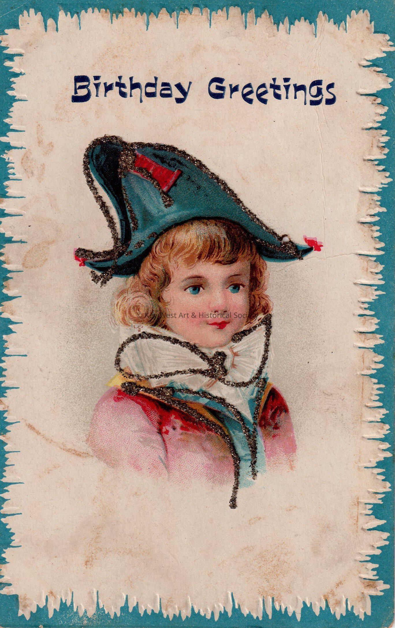 Postcard depicting a young child in a hat and fancy collar. The caption reads, ‘Birthday Greetings’. The message on the verso reads, ‘To Carolyn, Wishing you a Happy Birthday, from Uncle Claude, September 15, 1910.’ The card is addressed to Miss Carolyn Hattrick, 2113 Manton Street, Philadelphia, Pennsylvania.Collection