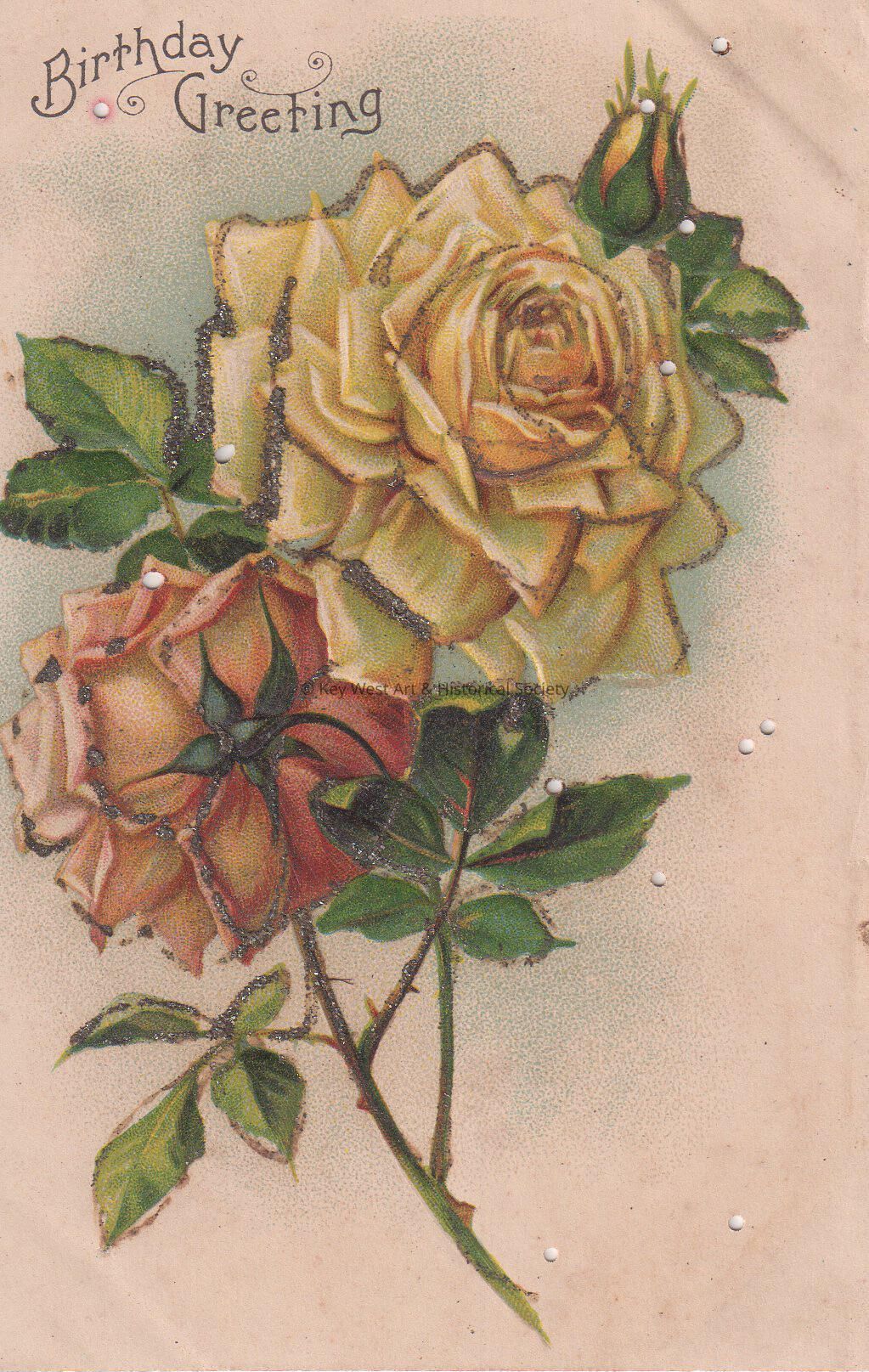 Postcard depicting roses. The caption reads, ‘Birthday Greetings’.Collection