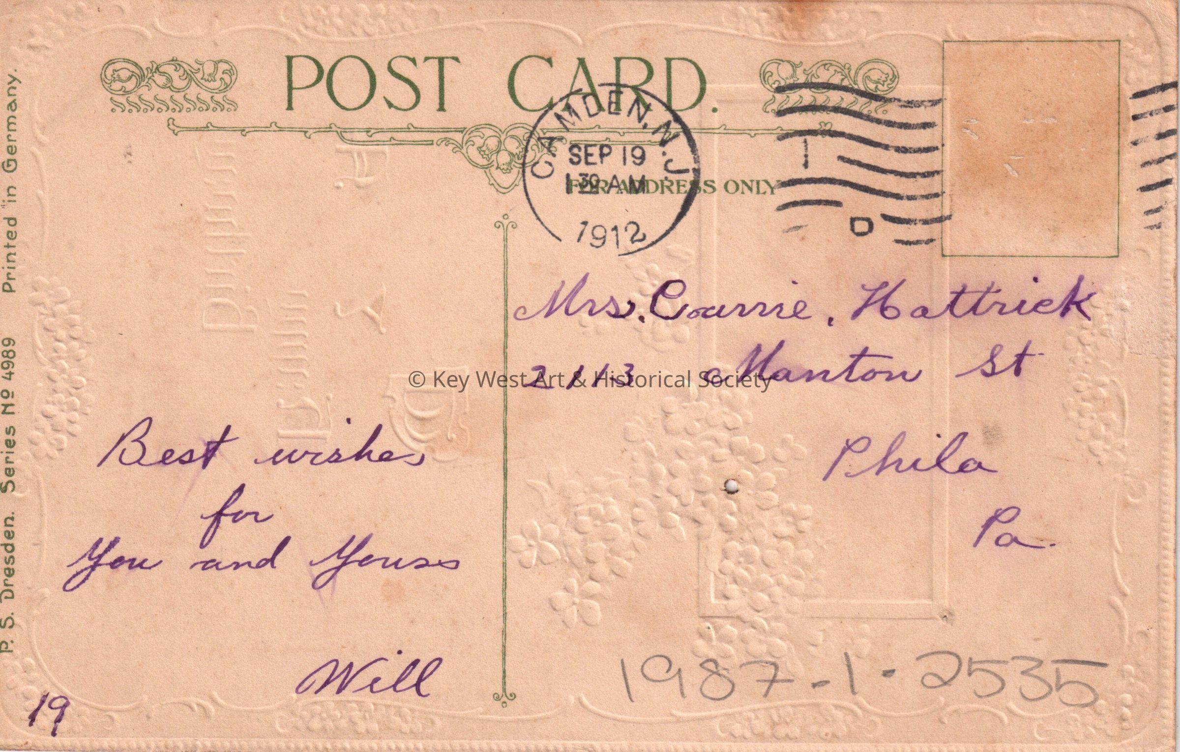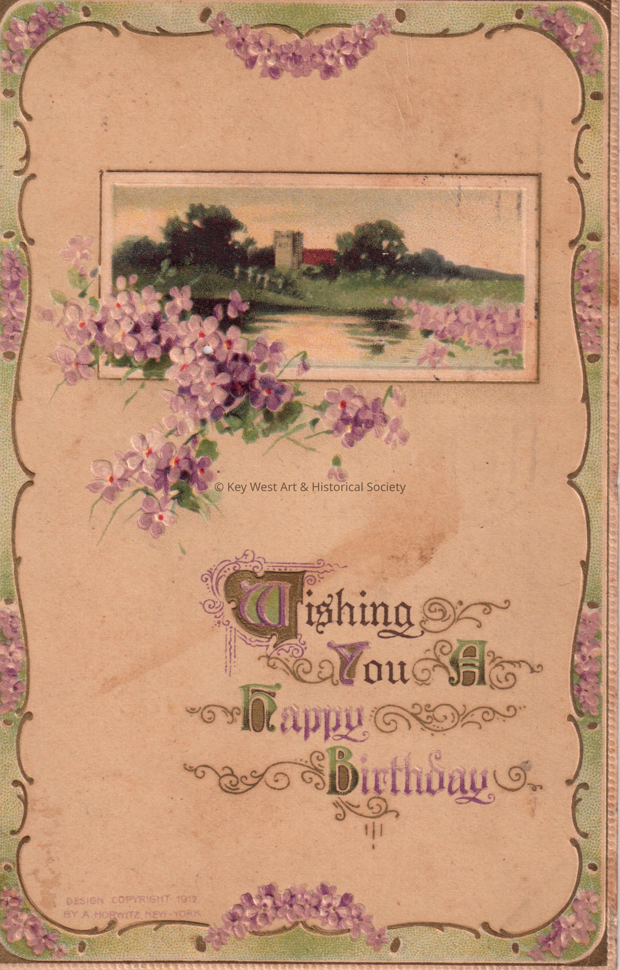 Postcard depicting flowers around a painting of a pastoral setting. The caption reads, ‘Wishing you a Happy Birthday’. The message on the verso reads, ‘Best wishes for you and yours. Will’. The card is addressed to Mrs. Carrie Hattrick, 2113 Manton Street, Philadelphia, Pennsylvania, and is postmarked Camden, New Jersey, September 19, 1912.Collection