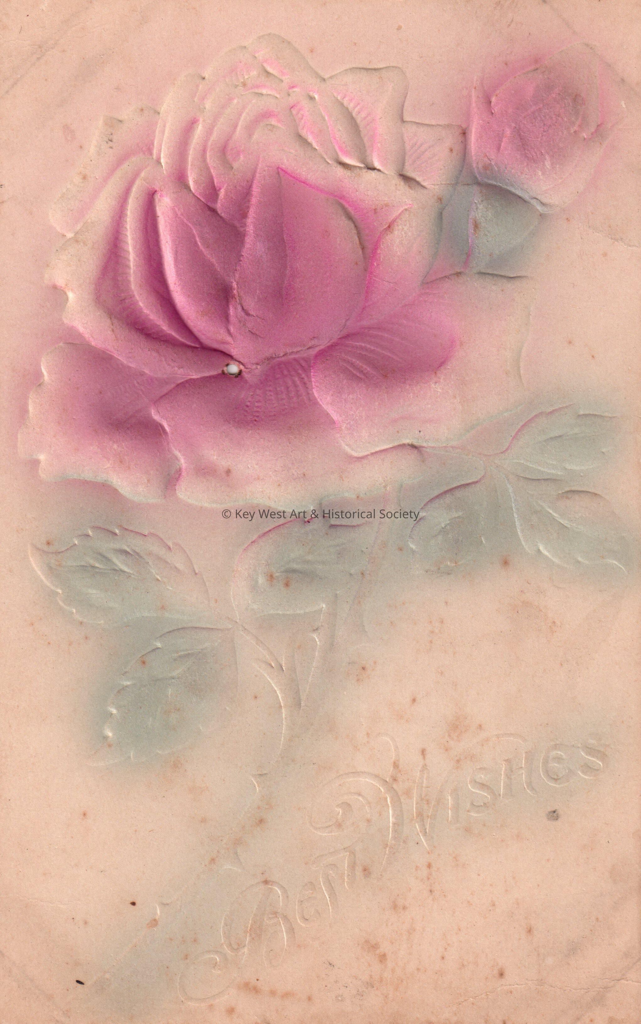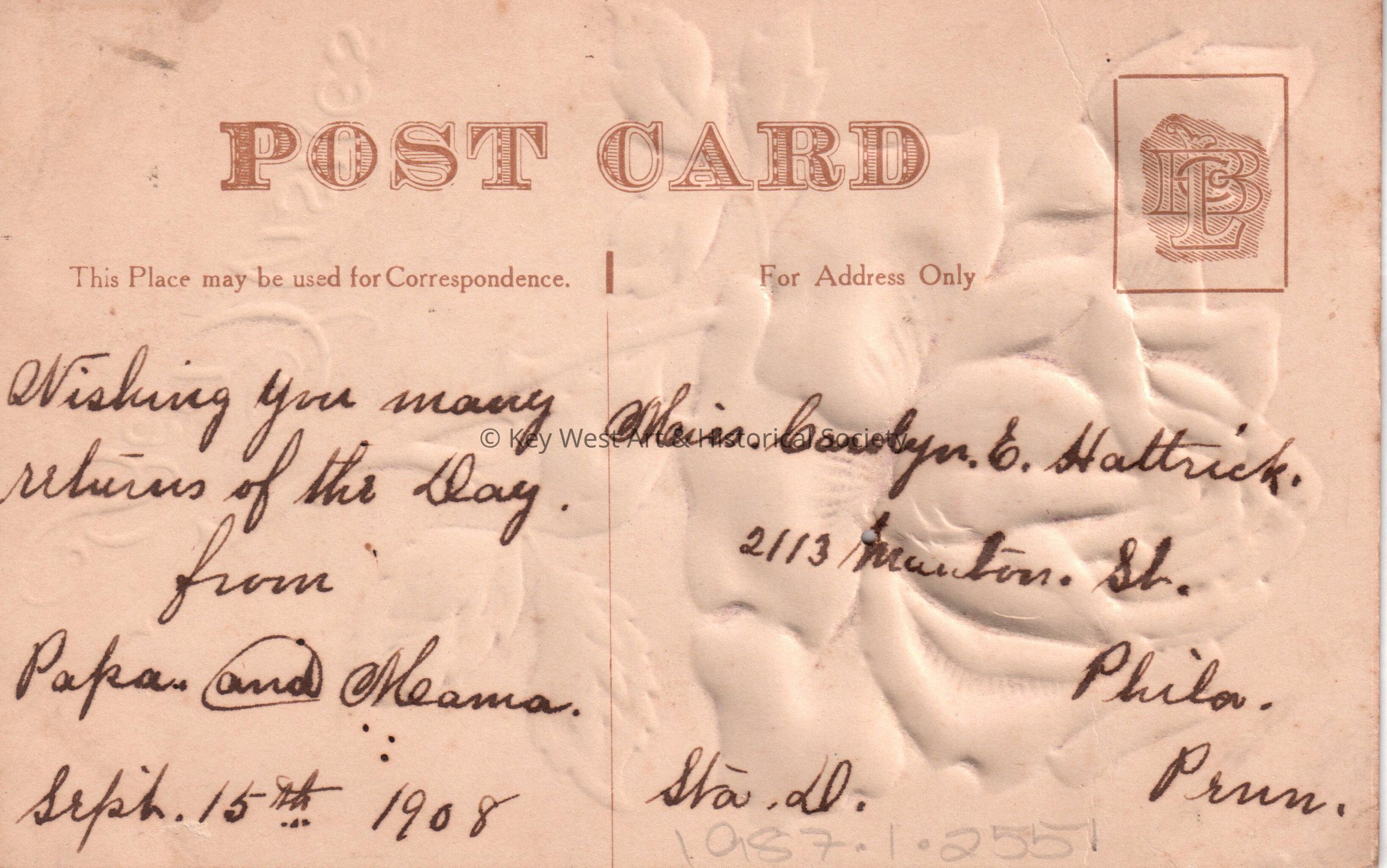 Postcard depicting roses. The caption reads, ‘Best Wishes’. The message on the verso reads, ‘Wishing you many returns of the day from Papa and Mama. September 15th, 1908’. The card is addressed to Miss Carolyn E. Hattrick, 2113 Manton Street, Station D, Philadelphia, Pennsylvania.Collection