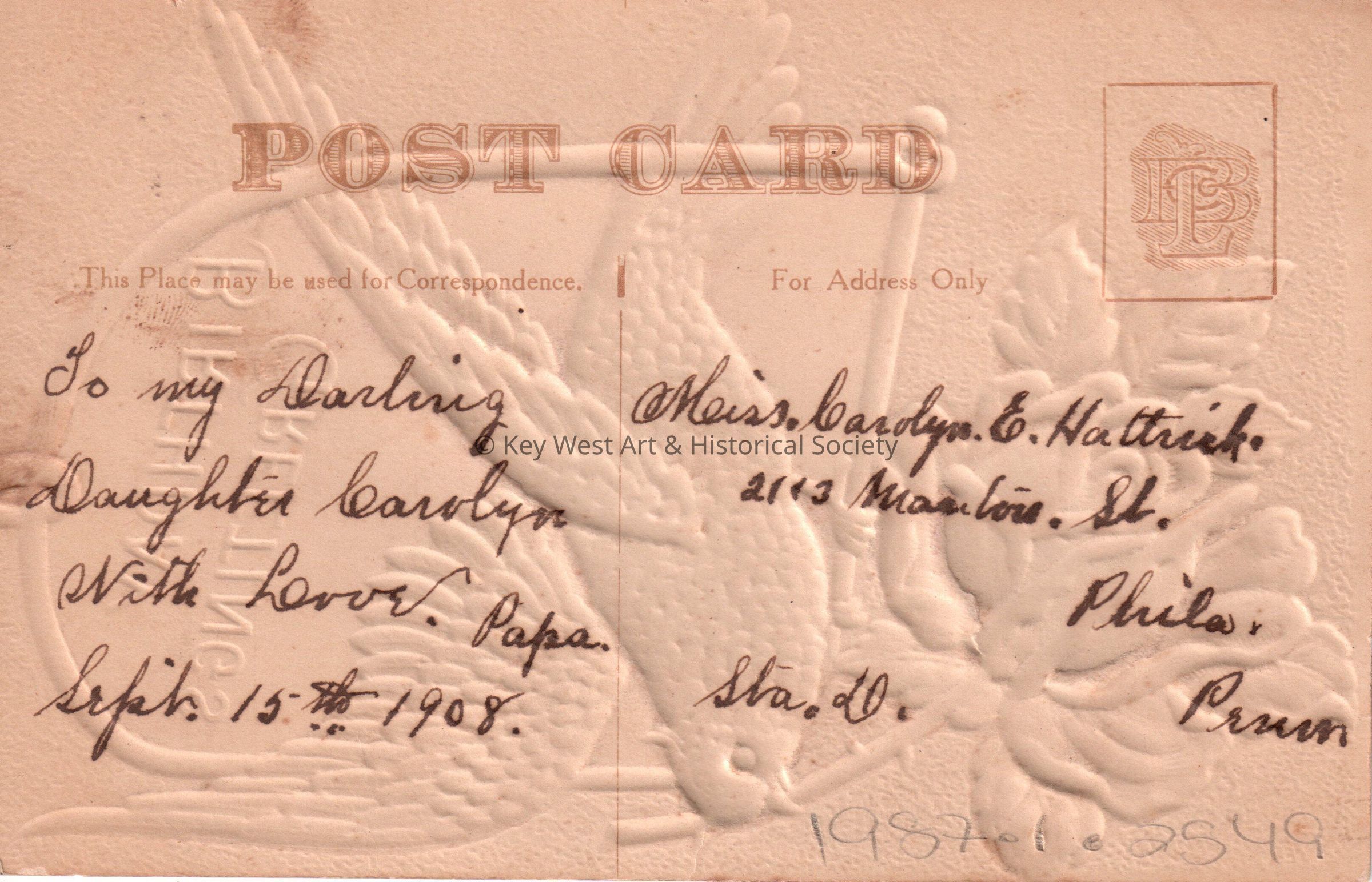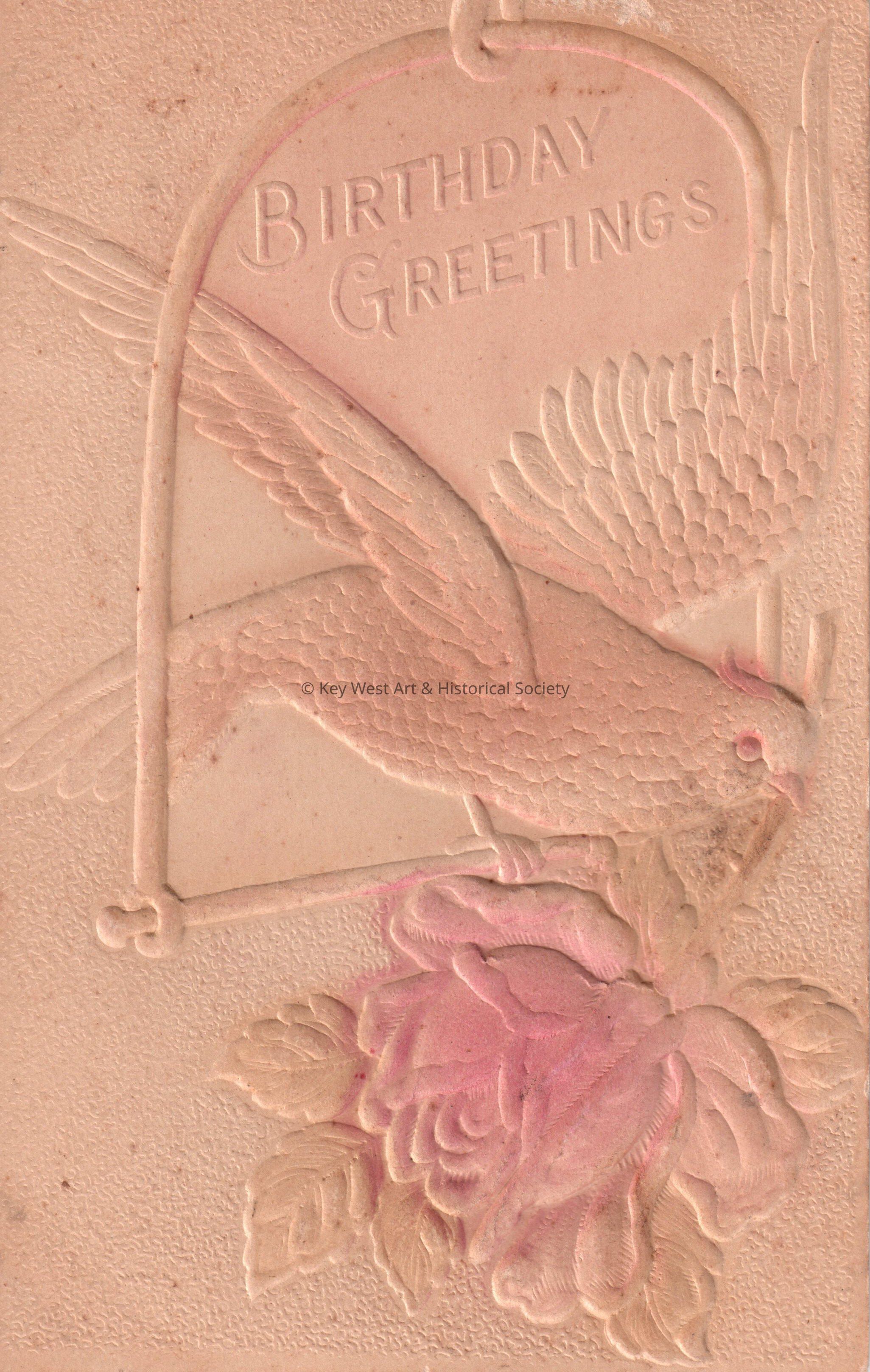 Postcard depicting a bird and flower. The caption reads, ‘Birthday Greetings’. The message on the verso reads, ‘To my darling daughter Carolyn, with love, Papa, September 15th, 1908’. The card is addressed to Miss Carolyn E. Hattrick, 2113 Manton Street, Station D, Philadelphia, Pennsylvania.Collection