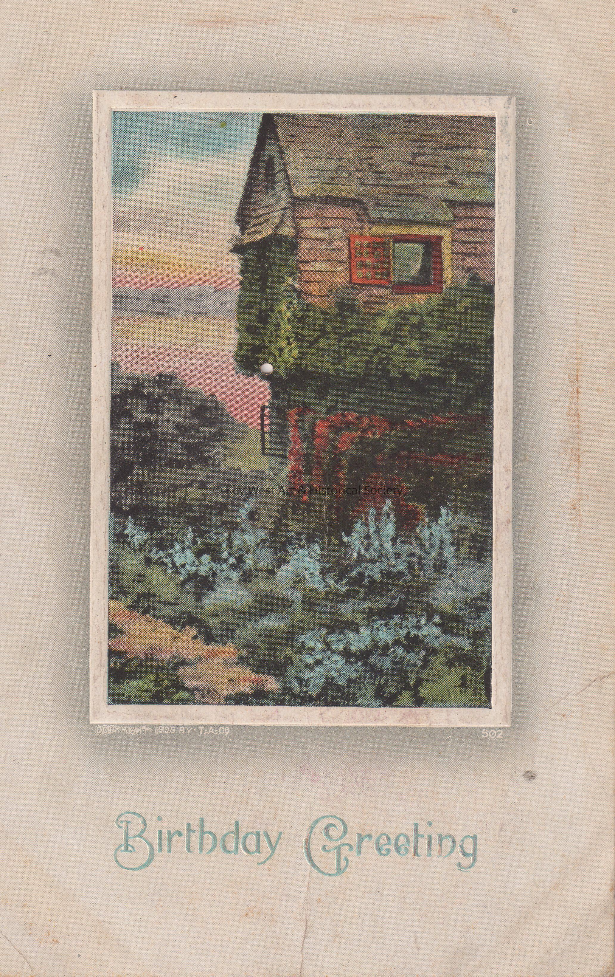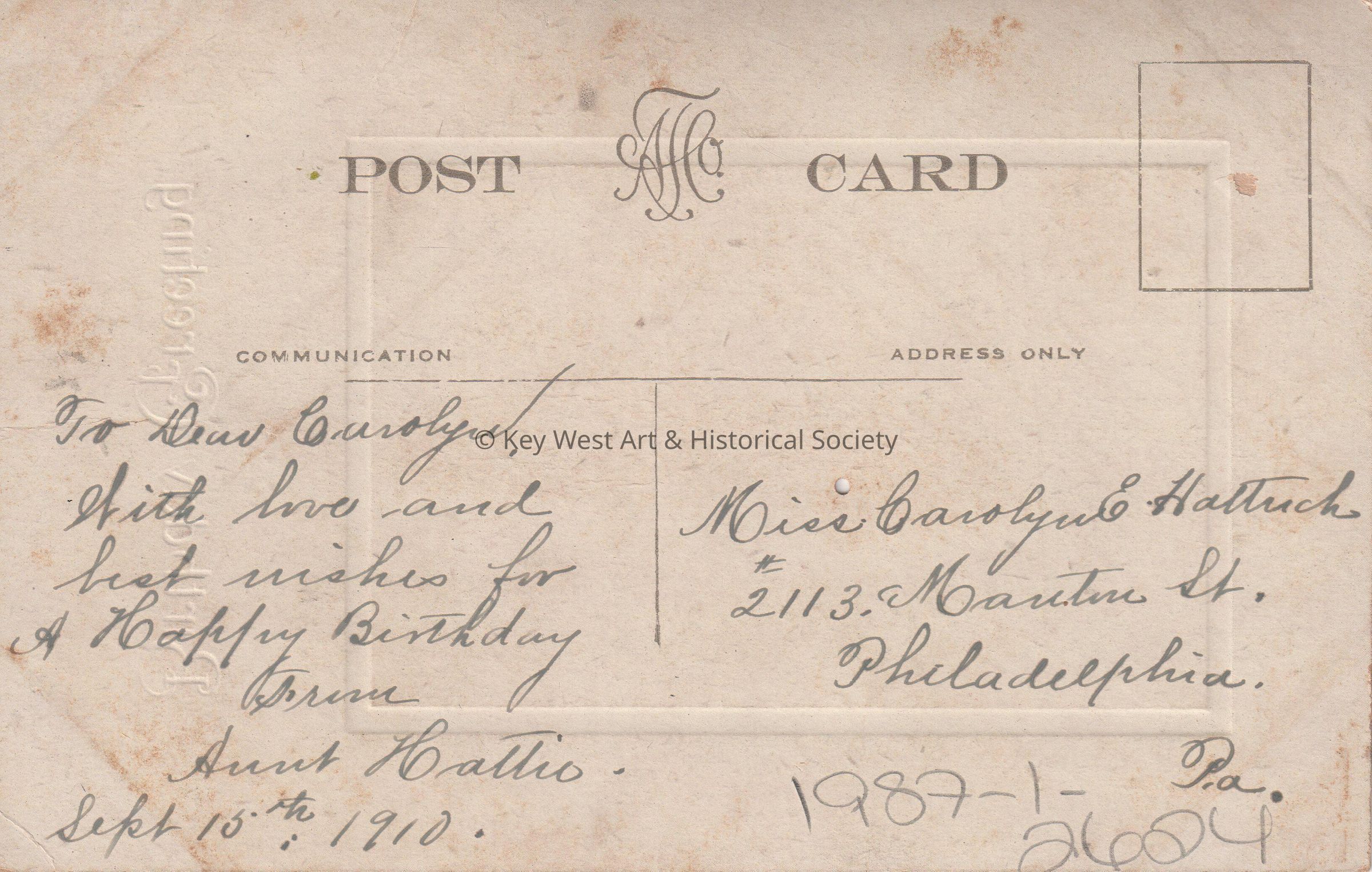 Postcard depicting a painting of an ivy-covered house and other foliage. The caption reads, ‘Birthday Greetings’. The message on the verso reads, ‘To Dear Carolyn, With love and best wishes for a Happy Birthday, from Aunt Hattie, September 15th, 1910.’ The card is addressed to Miss Carolyn E. Hattrick, 2113 Manton Street, Philadelphia, Pennsylvania.Collection