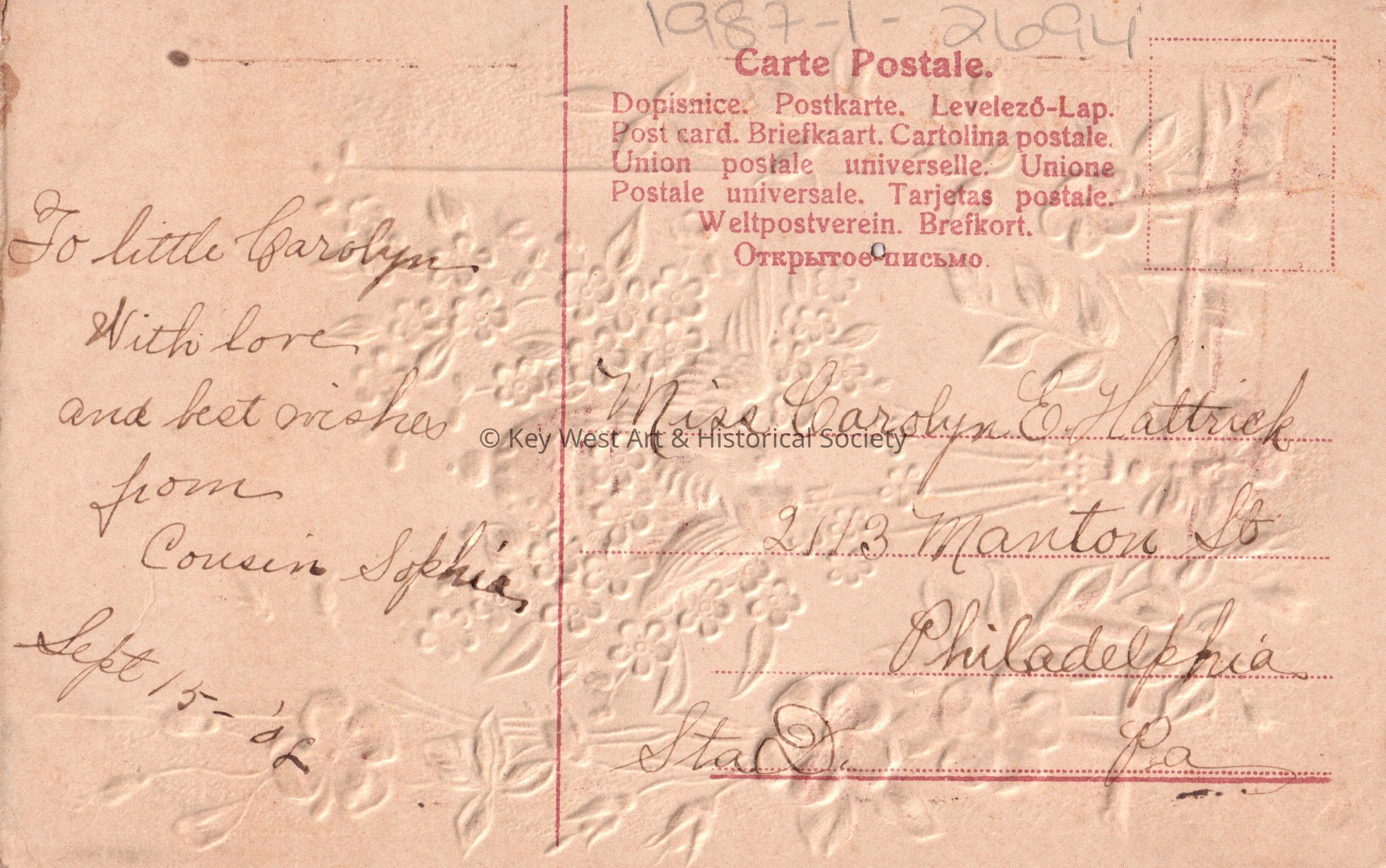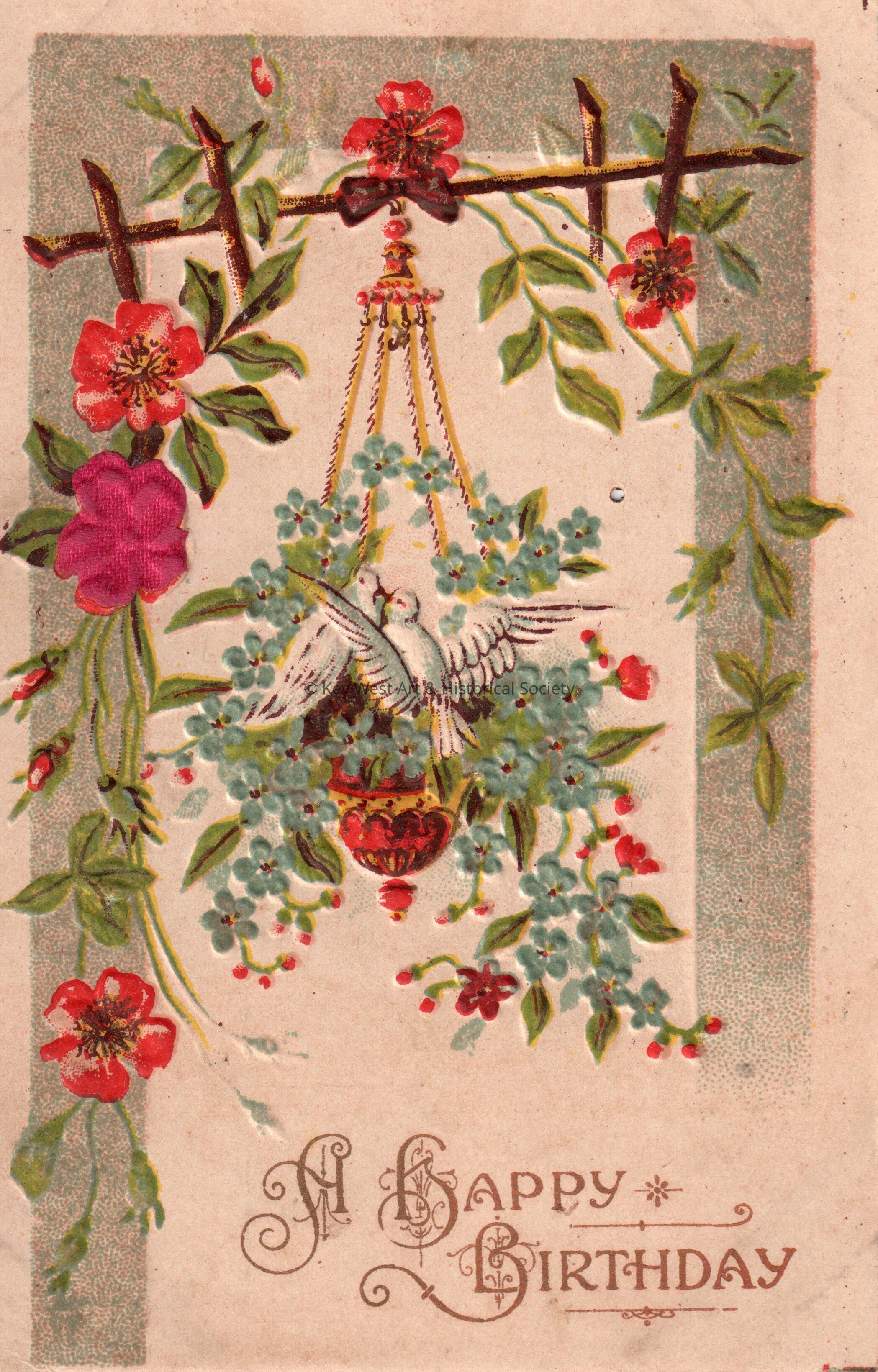 Postcard depicting doves and flowers. The caption reads, ‘A Happy Birthday’. The message on the verso reads, ‘To little Carolyn with love and best wishes from Cousin Sophia, September 15, 1908’. The card is addressed to Miss Carolyn E. Hattrick, 2113 Manton Street, Station D, Philadelphia, Pennsylvania.Collection