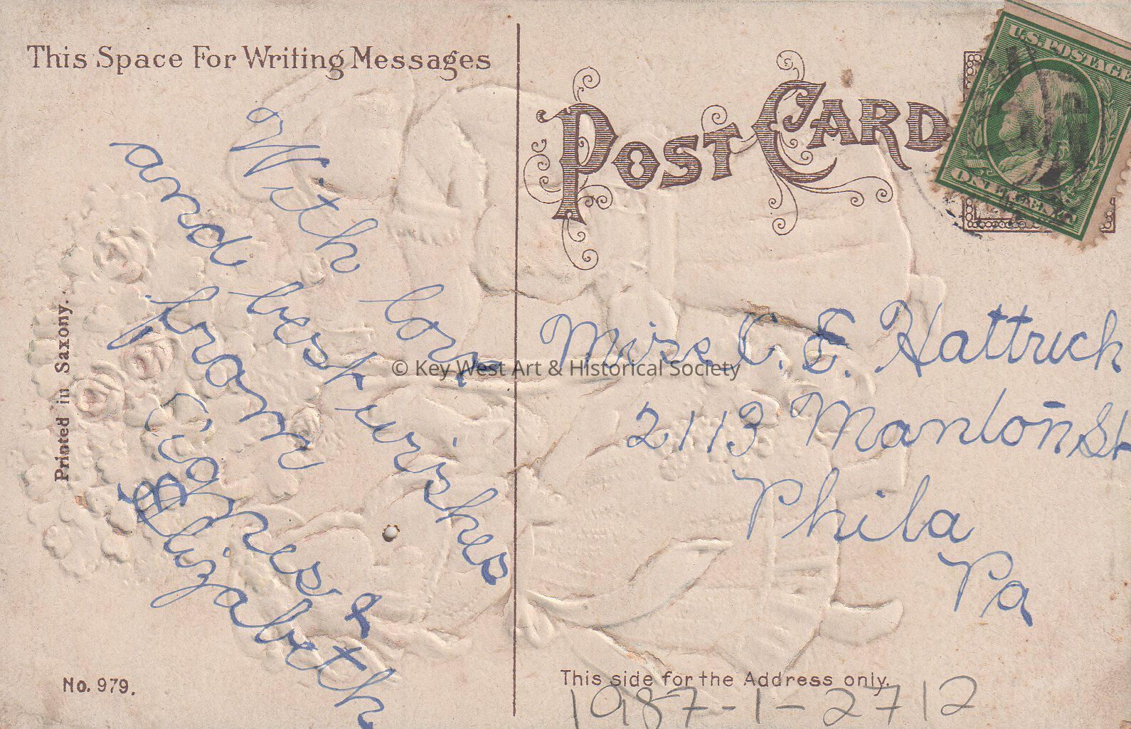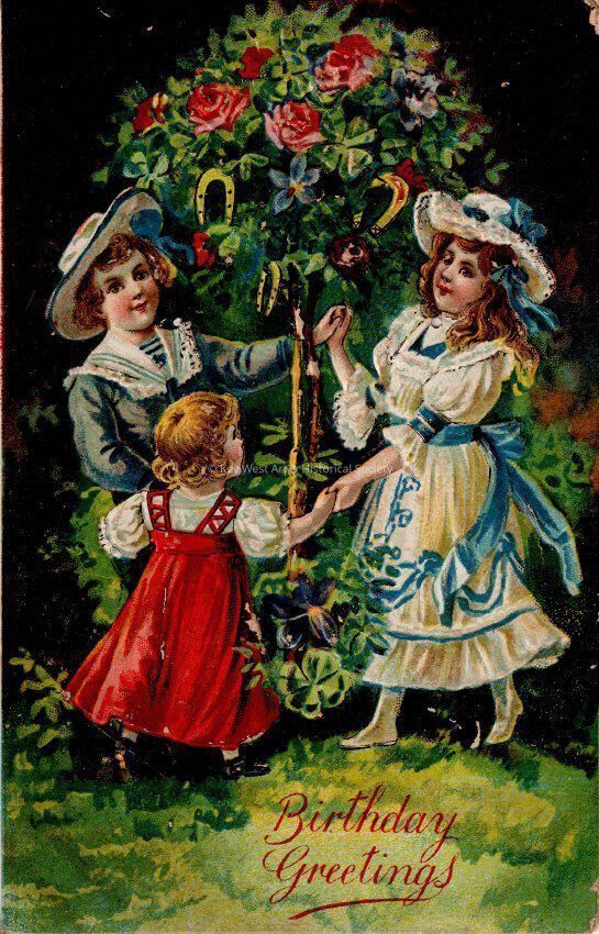 Postcard depicting three girls near flowers, horseshoes, and a shamrock. The caption reads, ‘Birthday Greetings'. The message on the verso reads, ‘With love and best wishes from Agnes and Elizabeth'. The card is addressed to Miss C.E. Hattrick, 2113 Manton Street, Philadelphia, Pennsylvania.Collection