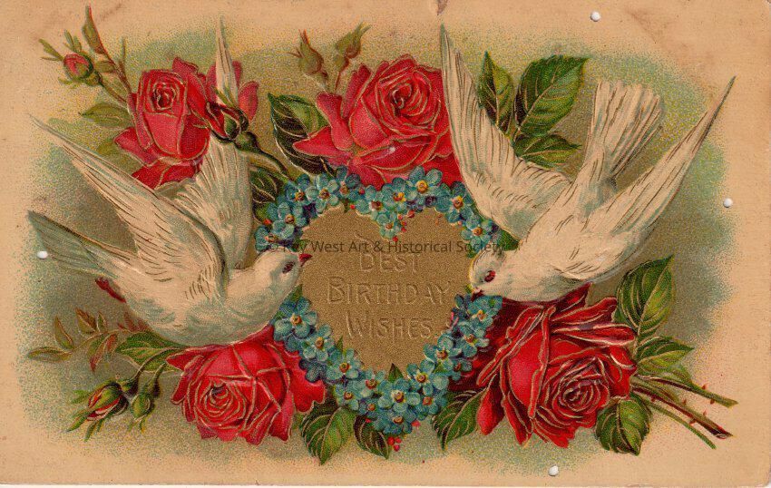 Postcard depicting roses and doves near a heart of flowers. The caption reads, ‘Best Birthday Wishes’. The message on the verso reads, ‘Better late than never. Congratulations, H. S. Mumford.’ The card is addressed to Mr. John Hattrick, 2113 Manton Street, City, and is postmarked Philadelphia, April 21, 1909.Collection