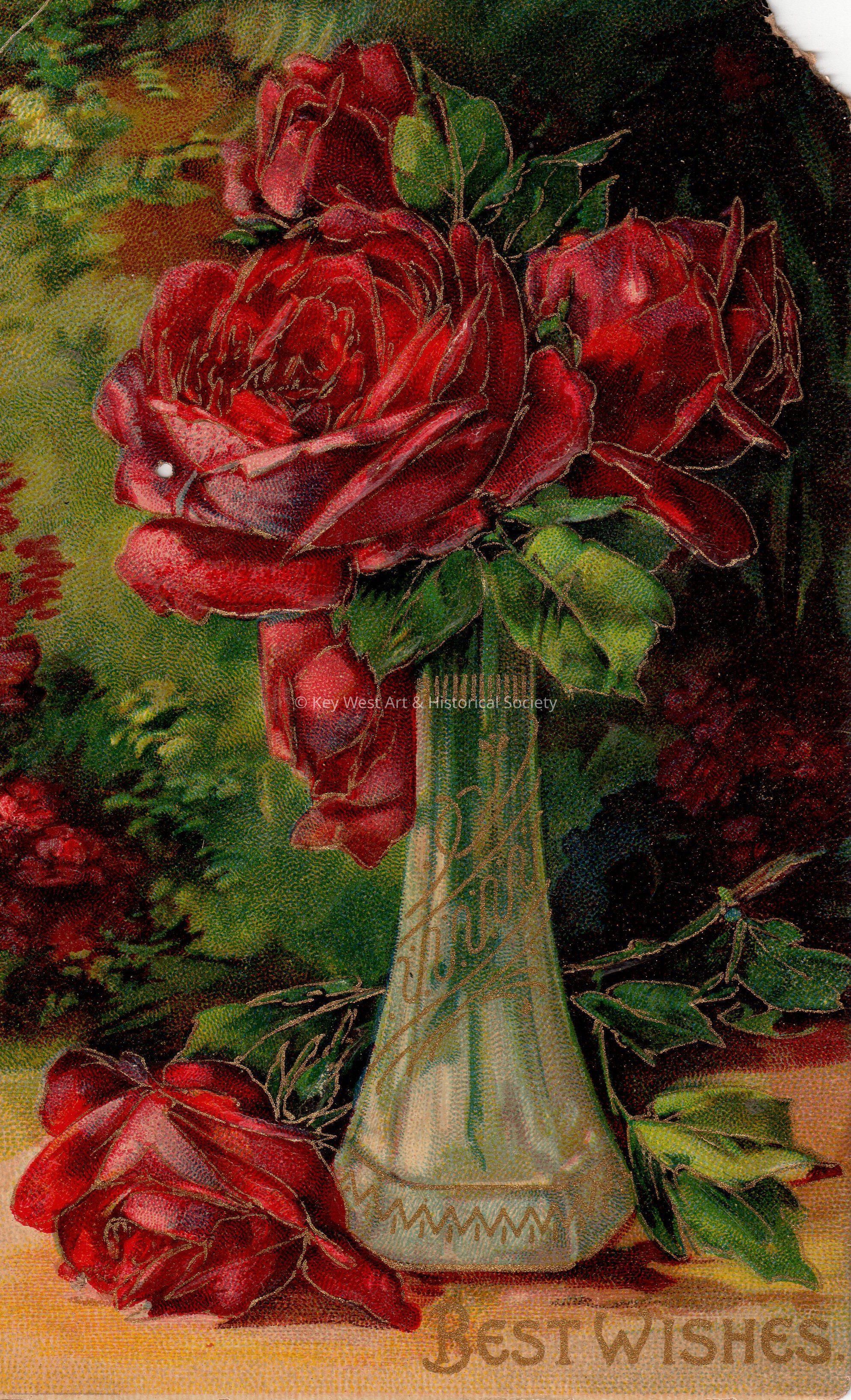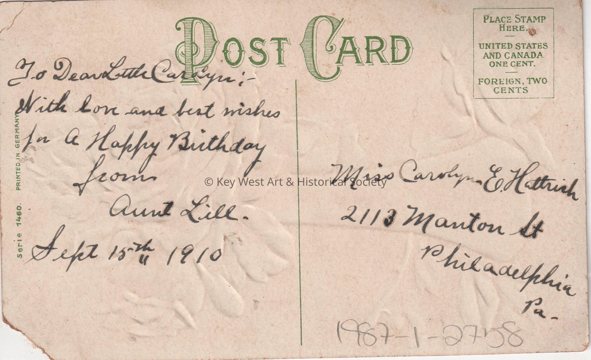 Postcard depicting a vase of roses. The caption reads, ‘Best Wishes.’ The message on the verso reads, ‘To Dear Little Carolyn, With love and best wishes for a Happy Birthday, from Aunt Lill, September 15th, 1910’. The card is addressed to Miss Carolyn E. Hattrick, 2113 Manton Street, Philadelphia, Pennsylvania.Collection