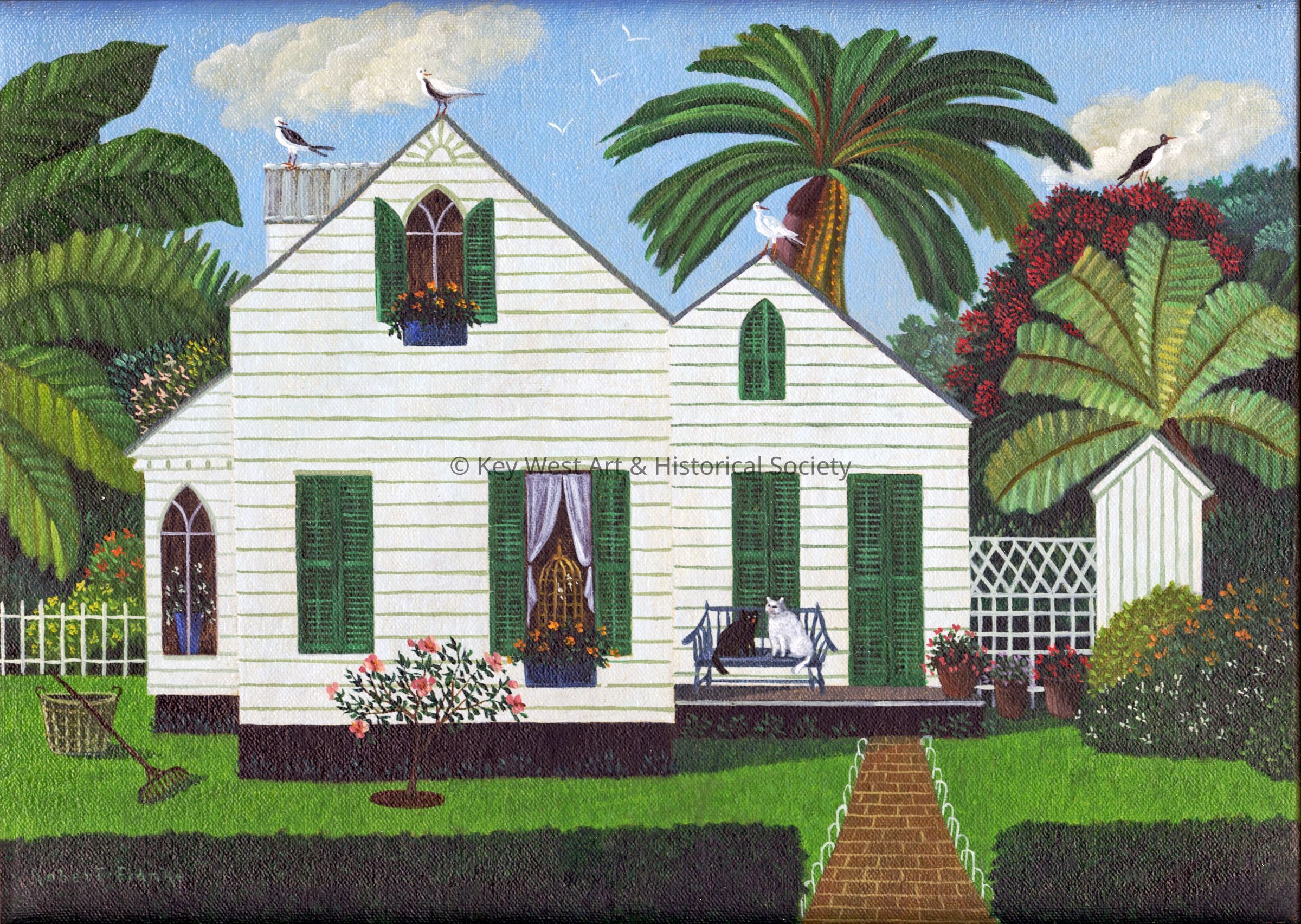 Oil painting on canvas by Robert Franke depicting a charming Conch cottage adorned with green shutters and surrounded by lush greenery, including palm and banana trees. On the porch, two cats—Black Beans and White Rice—sit comfortably on a blue bench, enjoying the serene environment. Birds perch on the roof, adding a touch of liveliness to the tranquil scene.Artwork Details