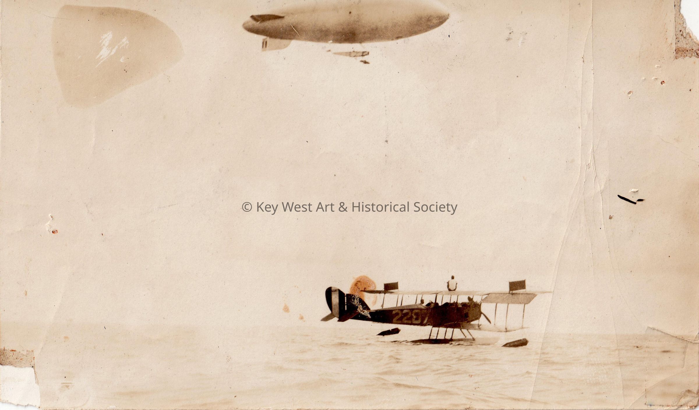 Black and white photograph of a U.S. Navy bimp and seaplane attached to Naval Station Key West at Trumbo Point.