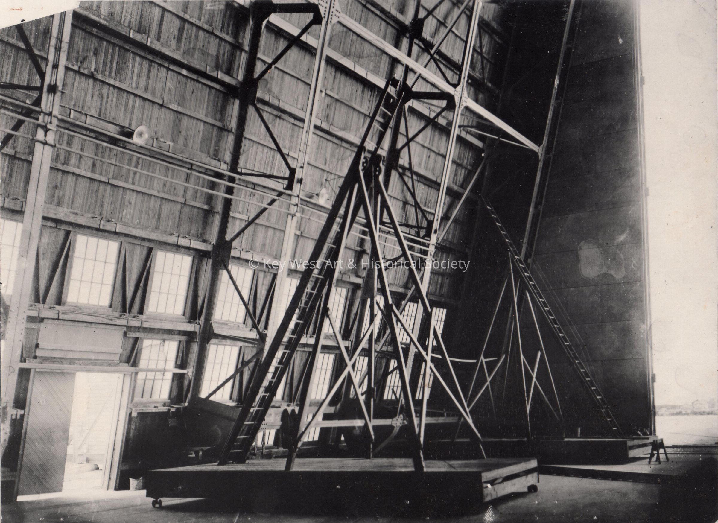 Black and white photograph of the interior the of blimp hanger at Naval Air Station Key West at Trumbo Point.