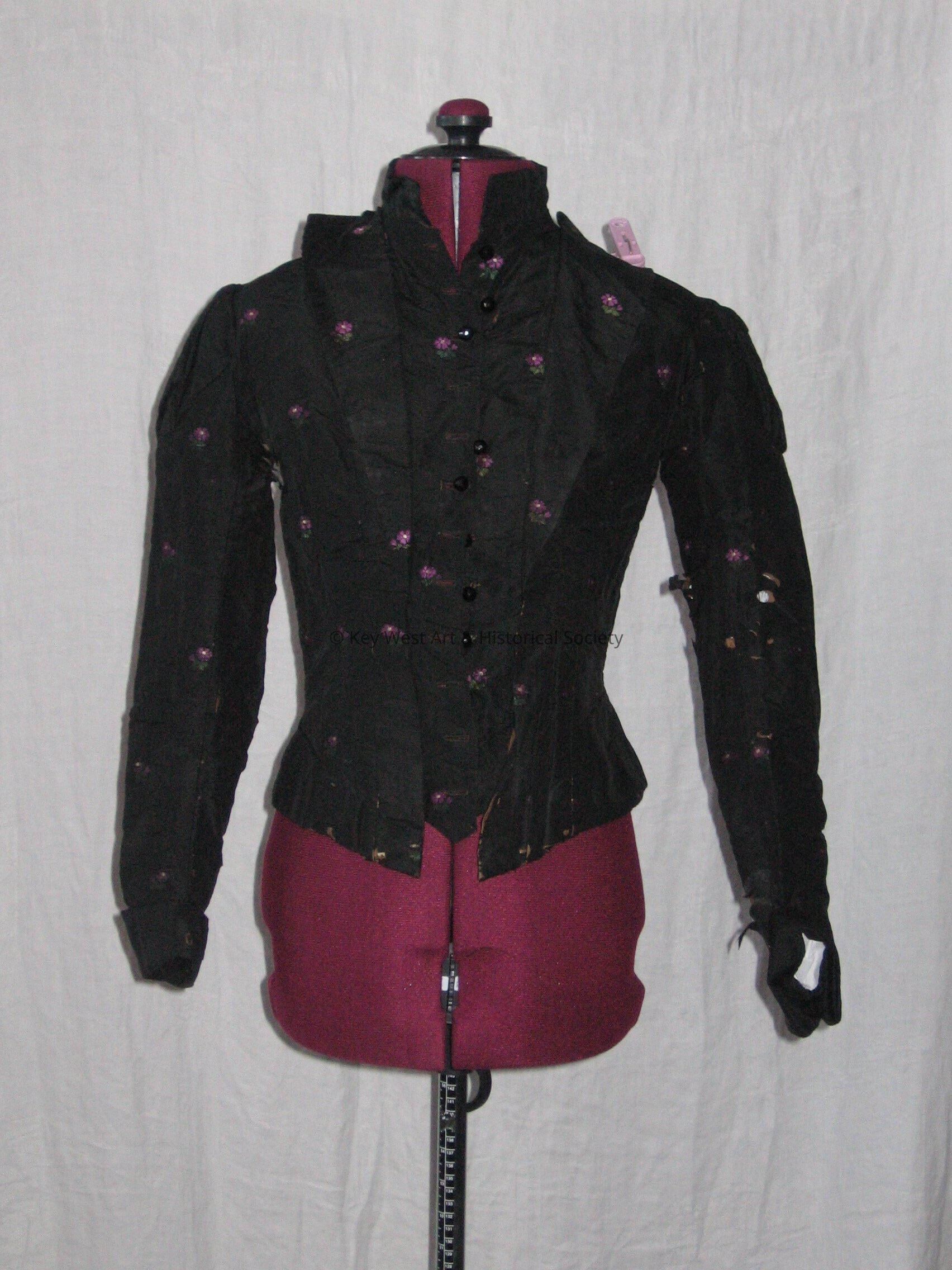 Black blouse with purple embroidered flowers. Button up front with black half circle buttons. Long sleeved with a fitted waist. High neck. Lapels on bodice.