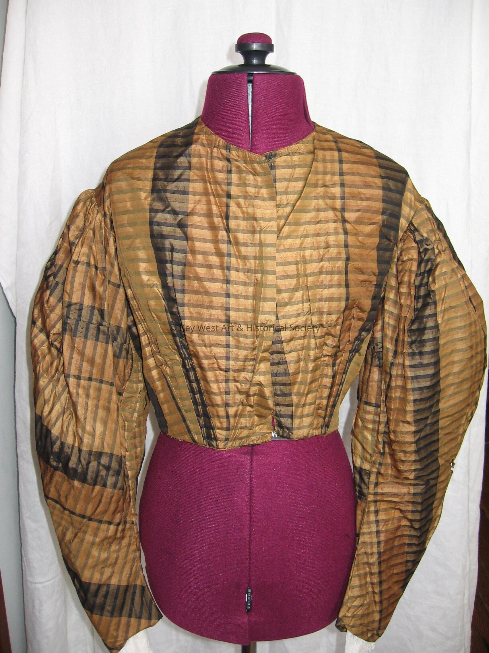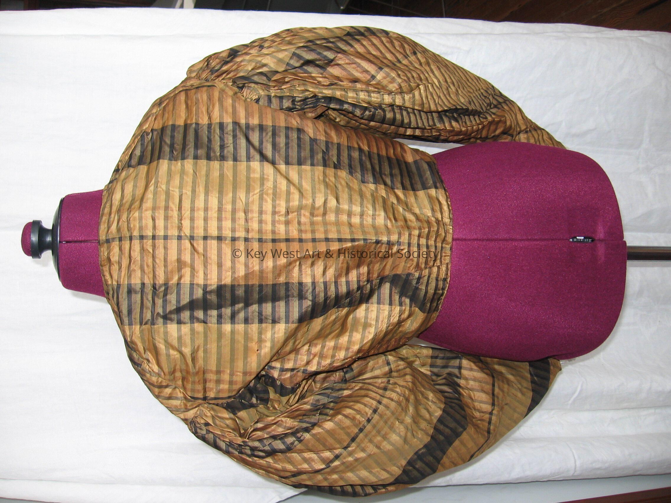 Brown and black taffeta blouse or jacket. Long sleeves. Hook and eye front closure. Fitted waist.