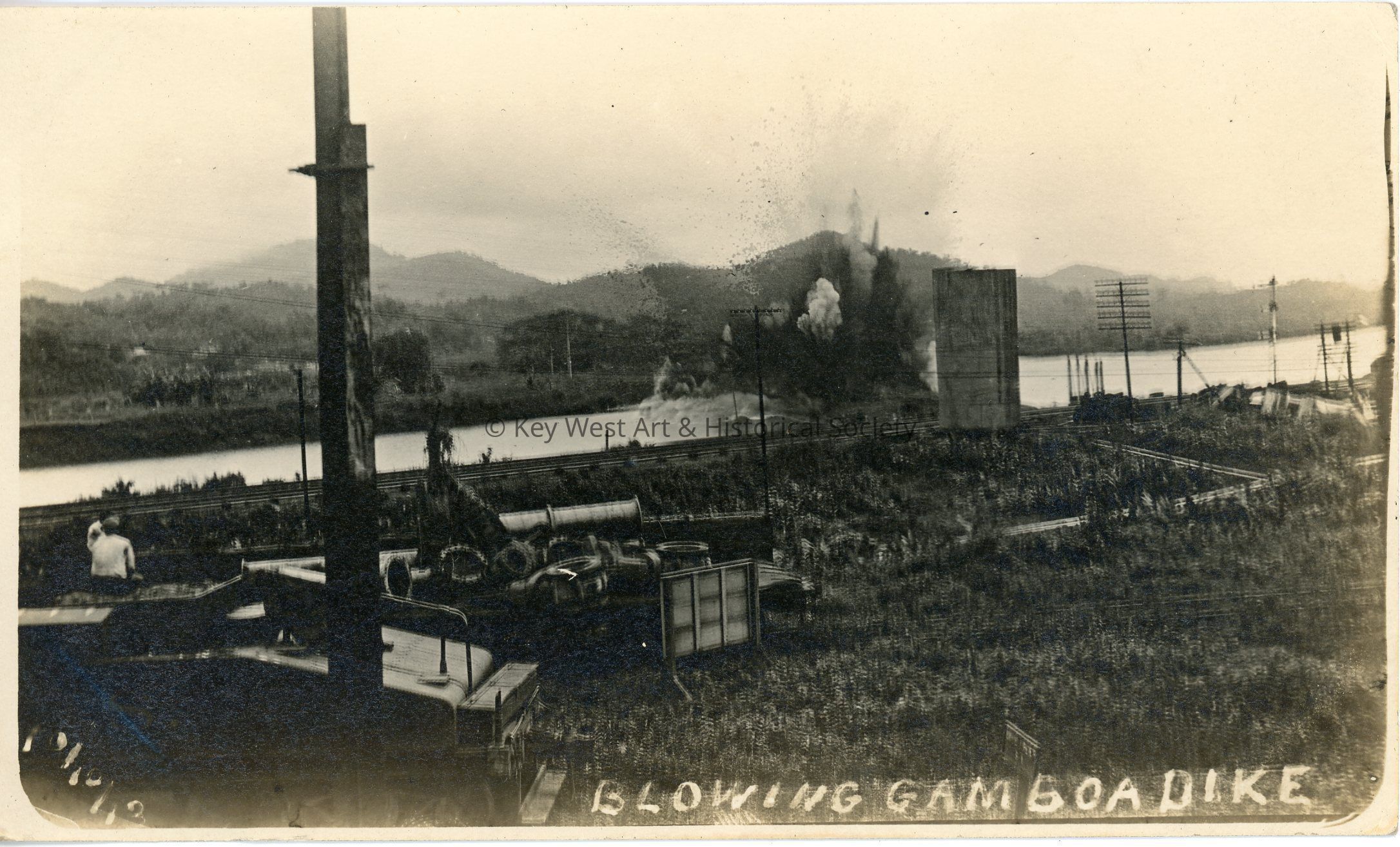 Black and white photograph depicting an explosion set off remotely by President Woodrow Wilson in Washington D.C. Text below the image reads 'Blowing Gamboa Dike.' The explosion cleared one of the last remaining barriers in the Culebra Cut, also known as the Gaillard Cut. The image is dated October 10, 1913. The photograph was designed to be attached to a postcard backing.Photograph Details