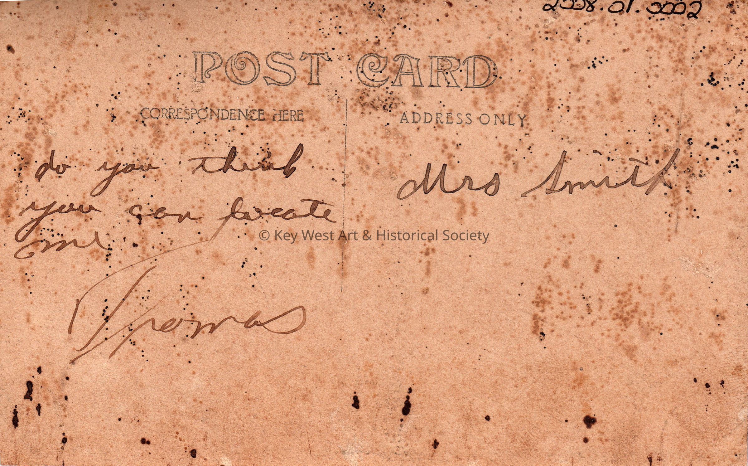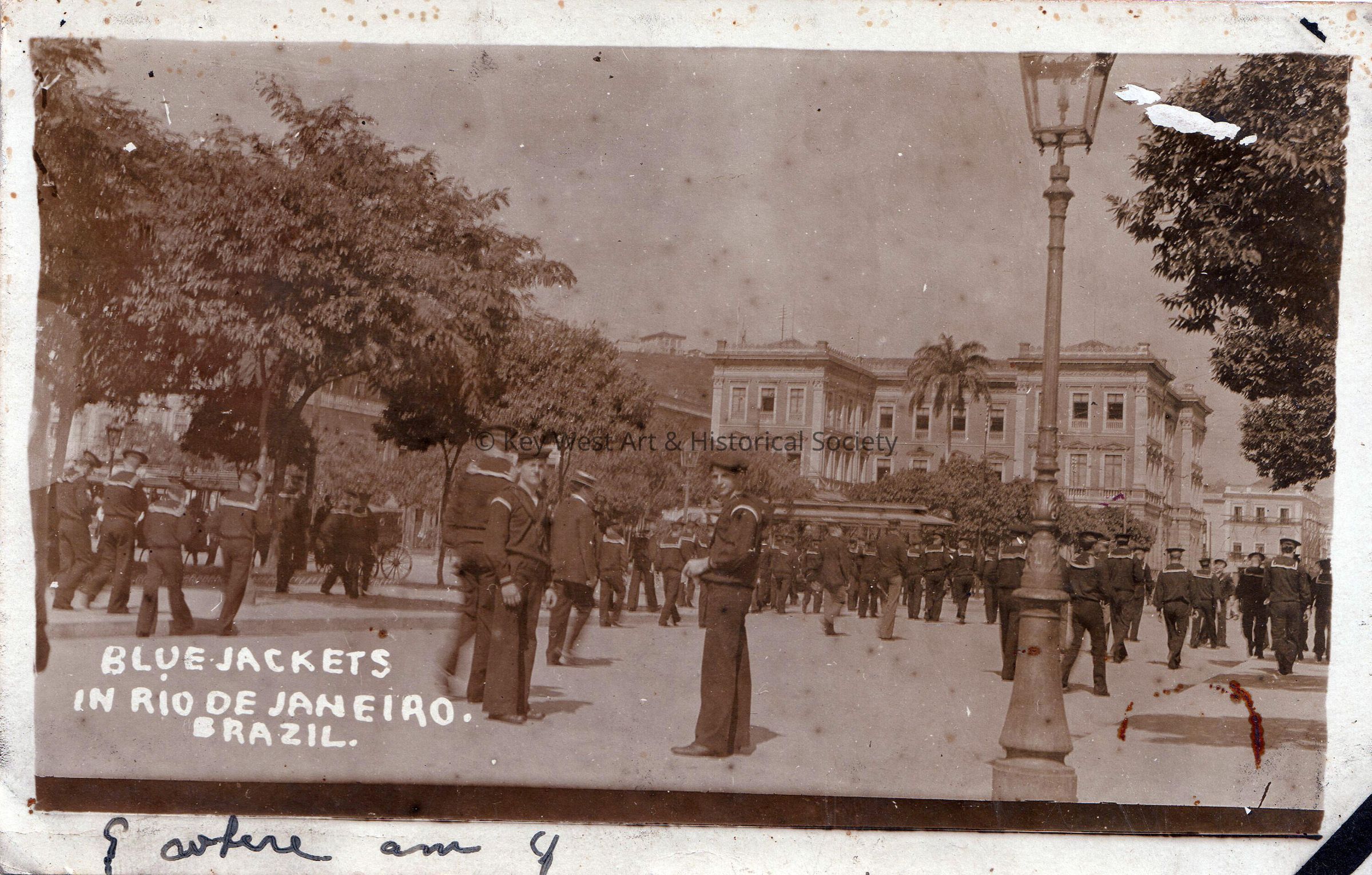Postcard depicting a group of sailors walking down a city street. The caption reads, ‘Blue Jackets in Rio de Janeiro, Brazil.' A message on the front reads, ‘Where am I?’ The message on the verso reads, ‘Do you think you can locate me. Thomas.’ The card is addressed to Mrs. Smith.Subject Person/Organization