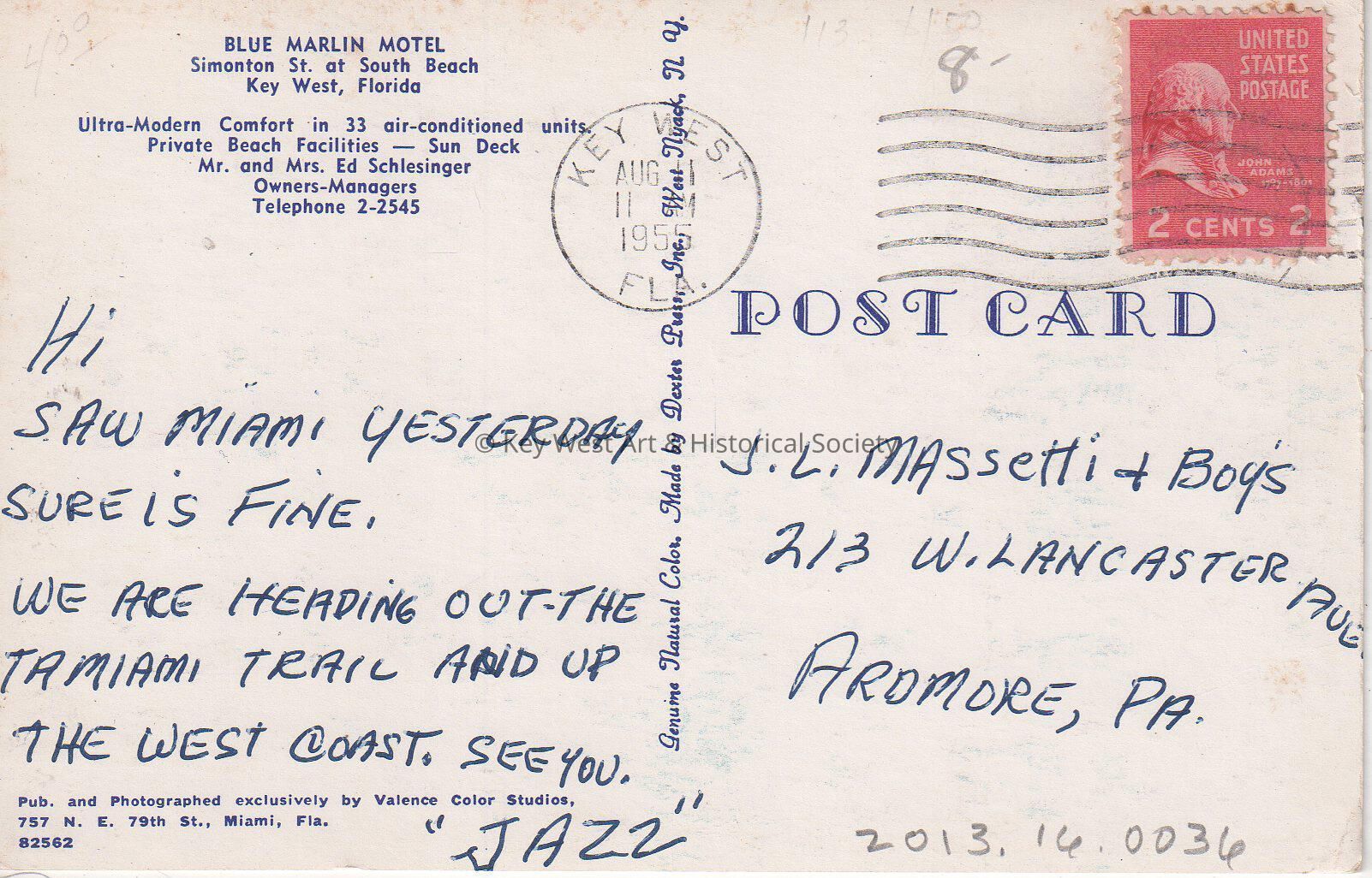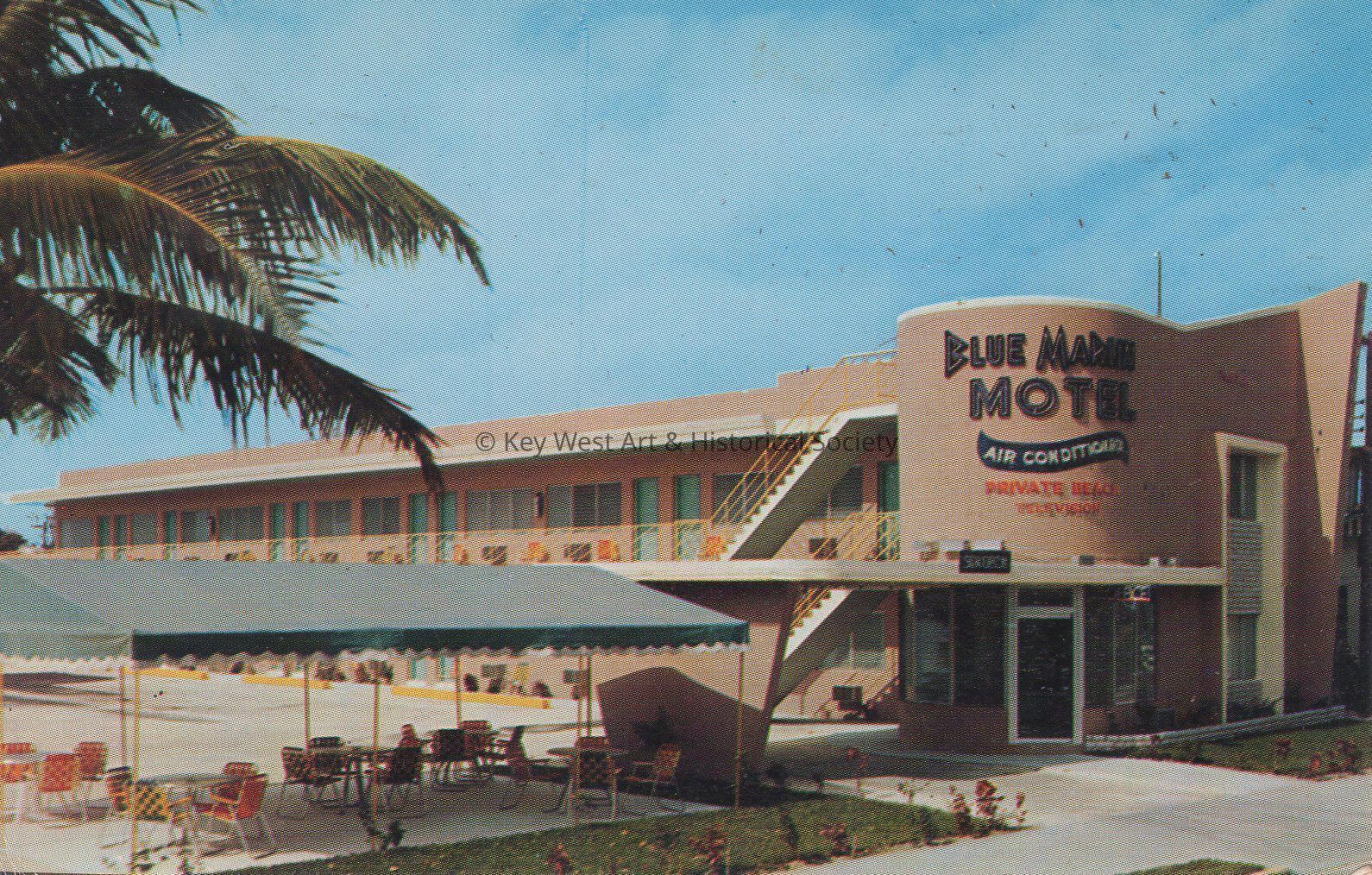 Postcard depicting a motel with a sign that reads, 'Blue Marlin Motel'. The description on the verso reads, 'Blue Marlin Motel, Simonton Street at South Beach, Key West, Florida. Ultra-modern comfort in 33 air-conditioned units. Private beach facilities - sun deck. Mr. and Mrs. Ed Schlesinger, owners-managers. Telephone 2-2545.'Subject Place