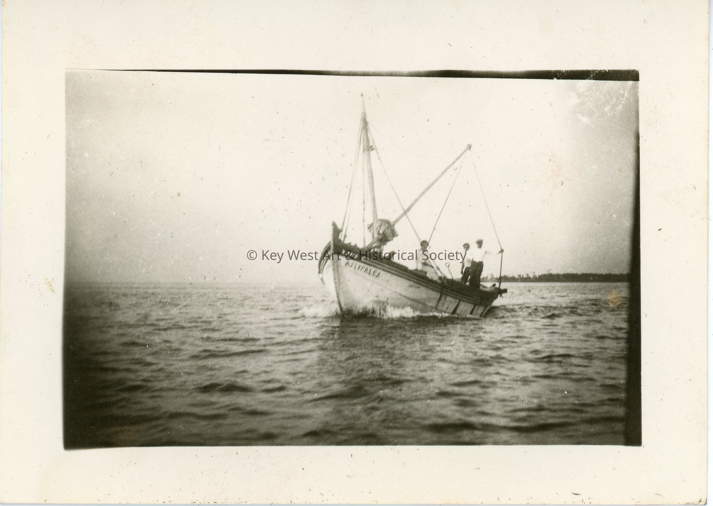 Black and white photograph of a vessel named "Astypalea" with 3 (three) passengers/crew. The photo was part of a photograph album began by Victor H. Baker in 1940.