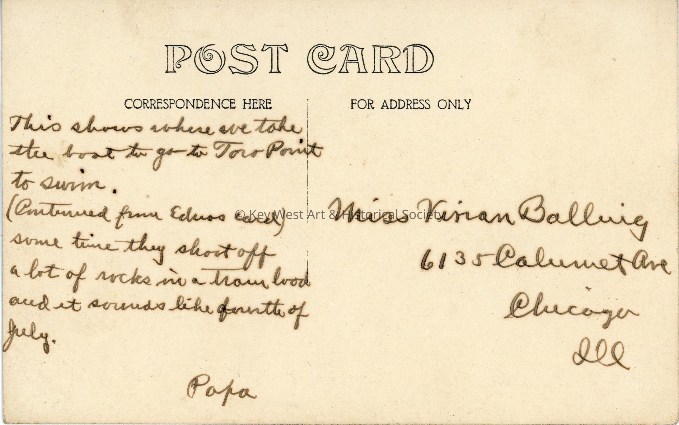 Black and white photograph postcard depicting where those who worked on the Canal would take a boat to Toro Point to swim. The postcard is addressed to Miss. Vivian Balling. Verso has a handwritten note.Subject