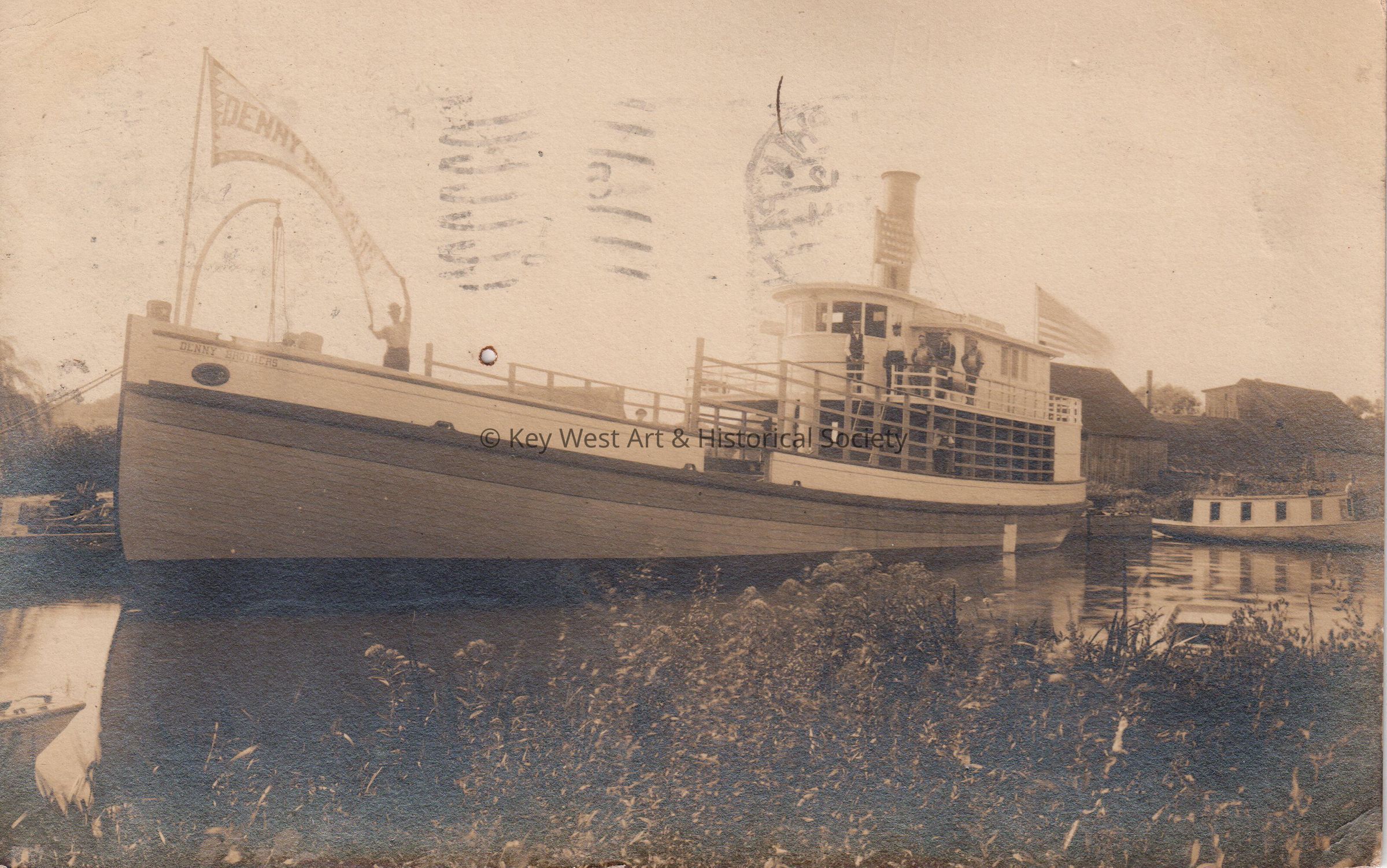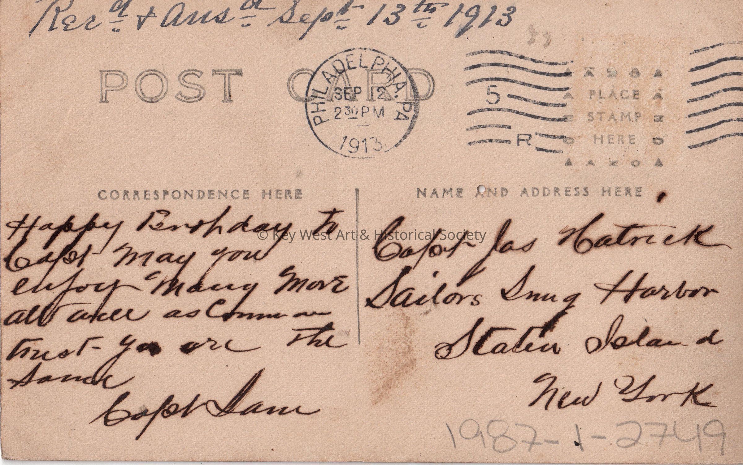 Postcard depicting boats in a canal. One boat is named DENNY BROTHERS. The message on the verso reads, ‘Happy Birthday to Captain. May you enjoy many more. All well as ___. Trust you are the same. Captain Sam’. Note on the verso reads, ‘Received and answered September 13, 1913.’ The card is addressed to Captain James Hattrick, Sailors Snug Harbor, Staten Island, New York, and is postmarked Philadelphia, September 12, 1913.Collection