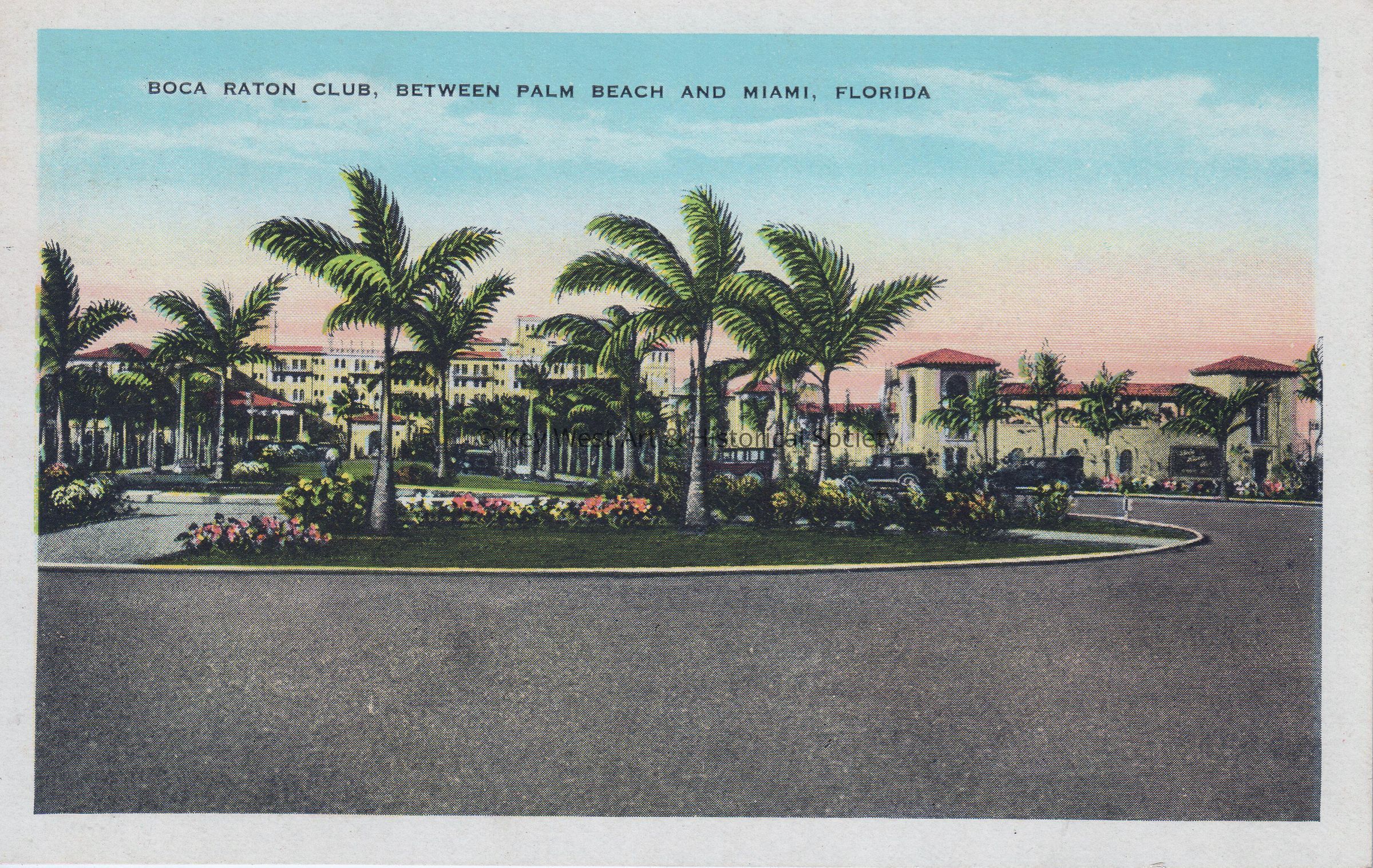 Postcard depicting a large building behind palm trees. The caption reads, ‘Boca Raton Club, Between Palm Beach and Miami, Florida.’ The description on the verso reads, ‘The Boca Raton Club, a palatial structure of the Spanish type of architecture, is located on a beautiful stretch of beach on the Florida east coast. 25 miles south of Palm Beach and 40 miles north of Miami. The Club owns two eighteen-hole golf courses. Other facilities include tennis courts, three salt water swimming pools and a fleet of fishing boats.’Collection