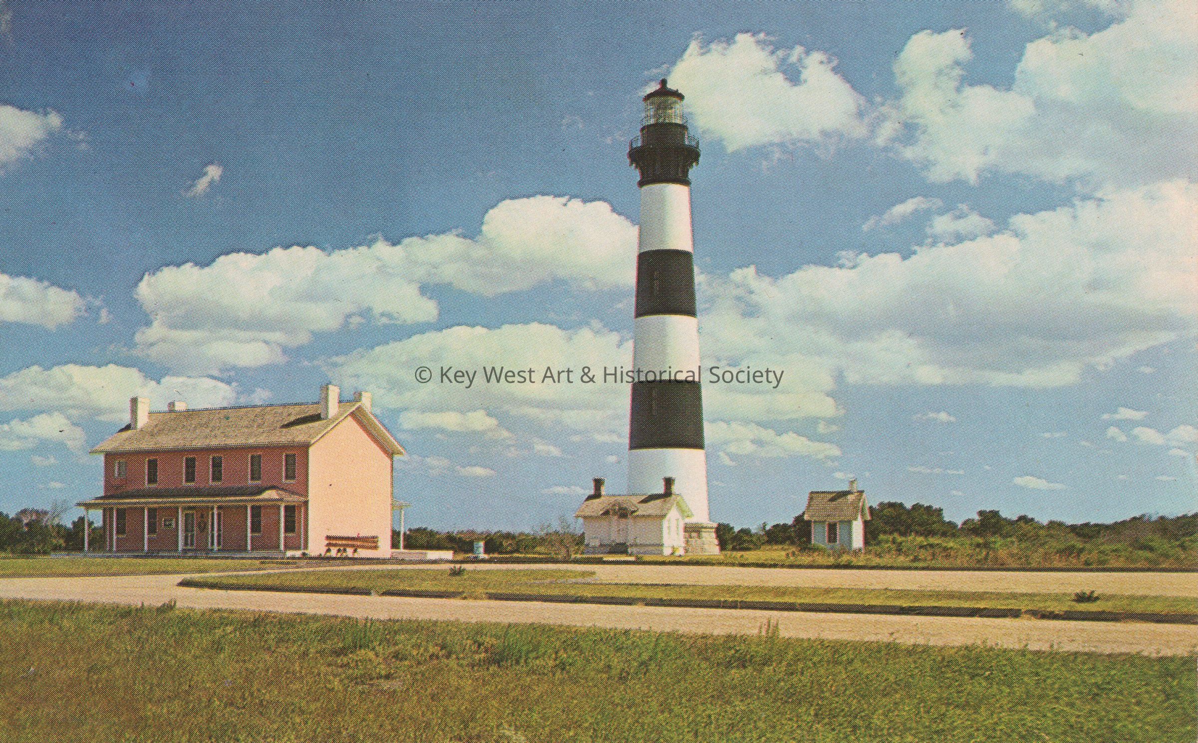 Postcard depicting a black and white lighthouse near a two-story building. The description on the verso reads, ‘The Outer Banks of North Carolina, Bodie Island Lighthouse. The Bodie Island Lighthouse is now a part of the Cape Hatteras National Seashore Park. The building in front of the Lighthouse which was used as the Keeper’s Lodging is now a museum.’Subject Place