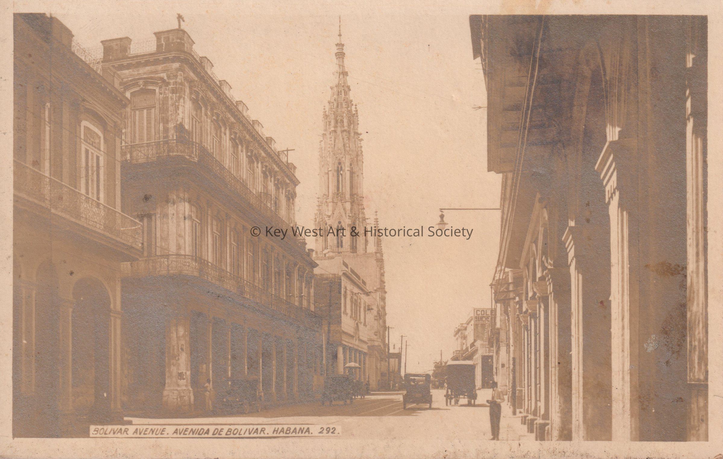 Postcard of cars and carriages on a street near buildings and a large church. The caption reads, ‘Bolivar Avenue, Avenida de Bolivar, Habana.’ The card is addressed to Key West and postmarked Pierce and Key West March 24.Subject Place