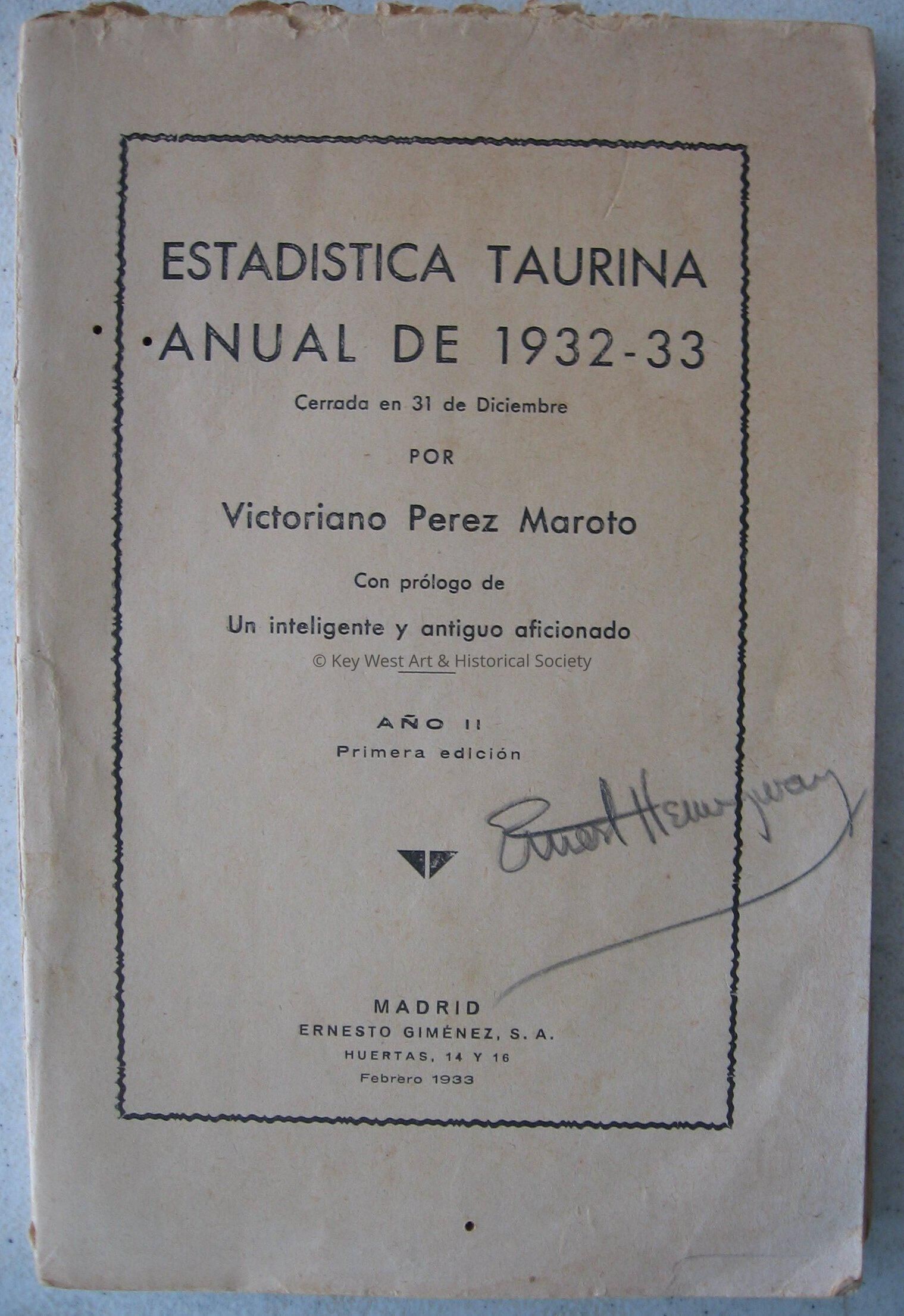 'Estadistica Taurina Anual de 1932-33.' Book on bullfighting schedules, times, places, fighters, and photographs. Ernest Hemingway signed the inside cover.Collection