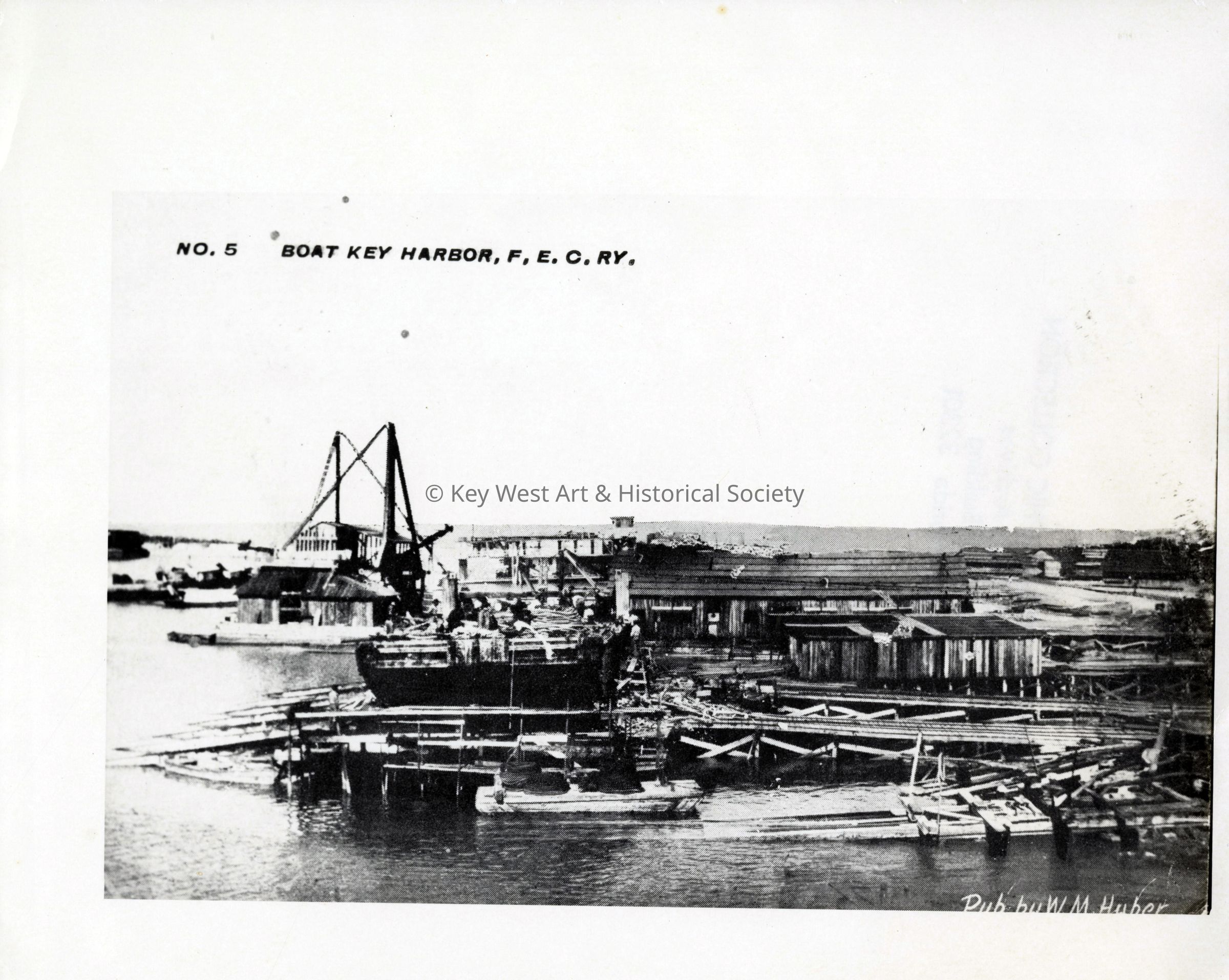 Black and white photograph of Boot Key Harbor (mistakenly captioned as Boat Key) when used during construction of the Florida East Coast Railway.