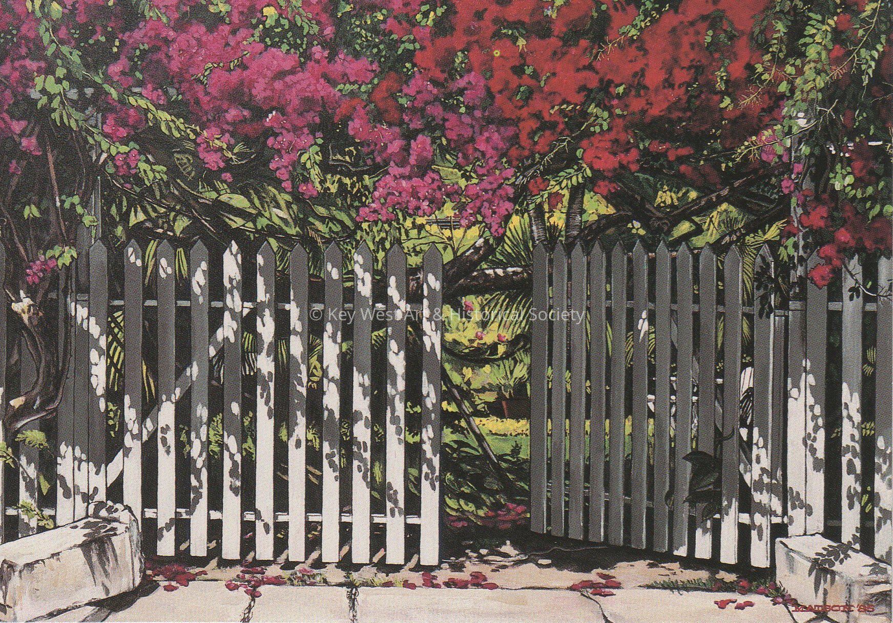 Postcard depicting bougainvillea growing near a gate. The description on the verso reads, ‘Matson 1985 Richard P. Matson “Bougainvillea/Key West” 24" by 36” Acrylic on Canvas.’Subject Place