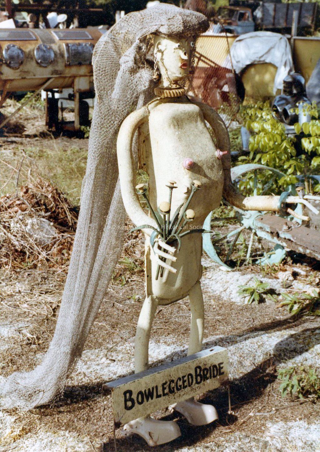 Freestanding sculpture by Stanley Papio depicting a standing female bride. Her arms are stretched out before her and she is holding a bouquet in her right hand and has a large ring on a finger of her left hand. Arms are adorned with bracelets. She is shown nude with an elaborate hat and long fishnet veil. Her torso is made from an oil pan, the base is a circular fly wheel disc, her arms and legs are exhaust pipes, her feet are chrome plated bumperguards, her earrings are chain and spring, and her ears, nose and mouth are washers.Type of Sculpture