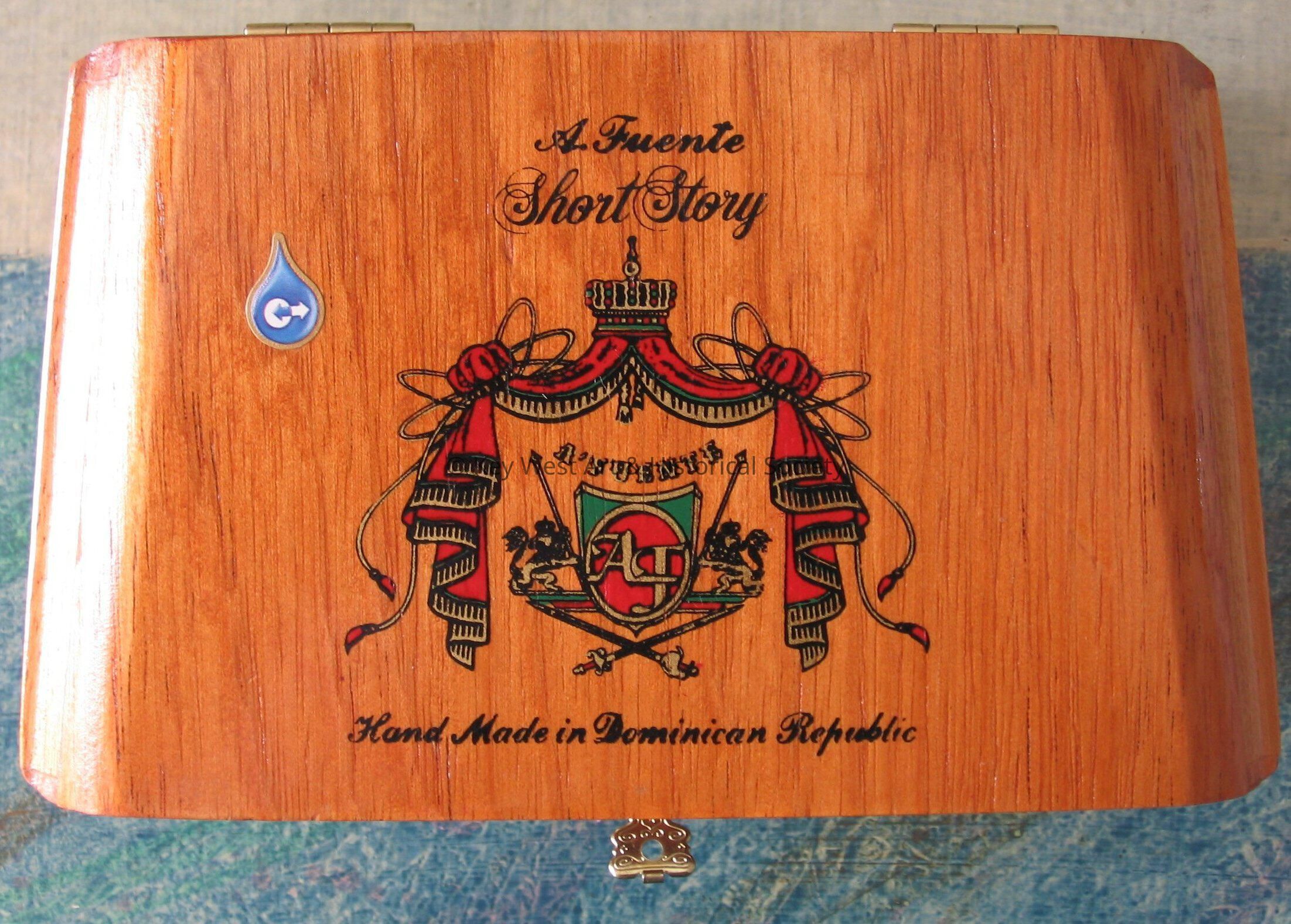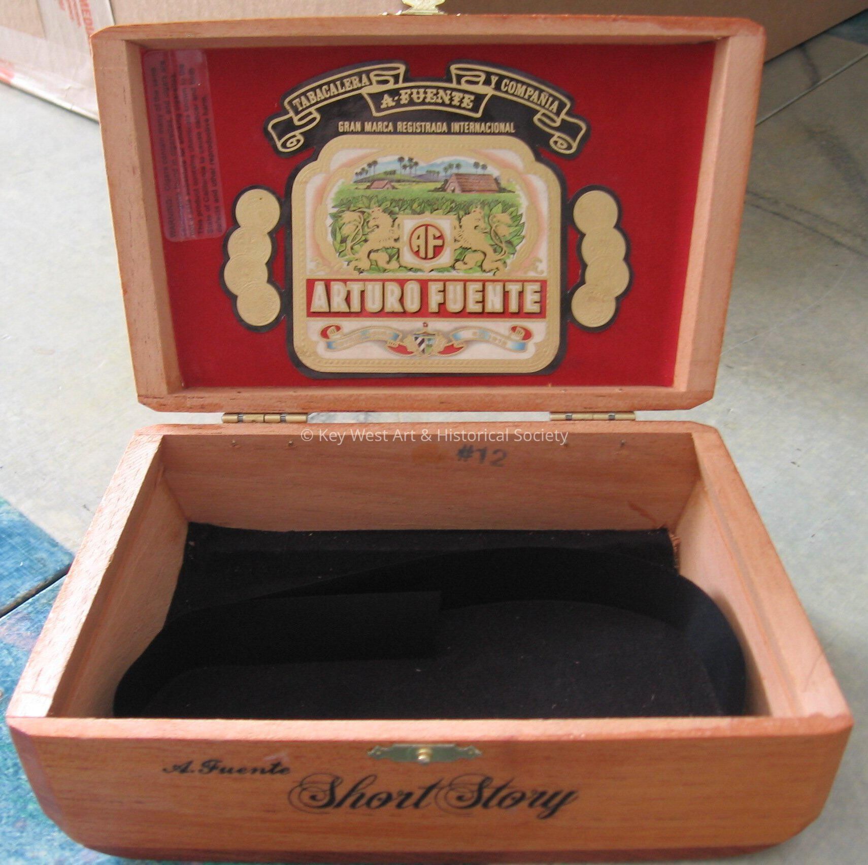 Wooden cigar box. Box reads "A. Fuente Short Story" "Hand Made in Dominican Republic. Black ribbon that reads "Reserva Short Story Especial" inside box.