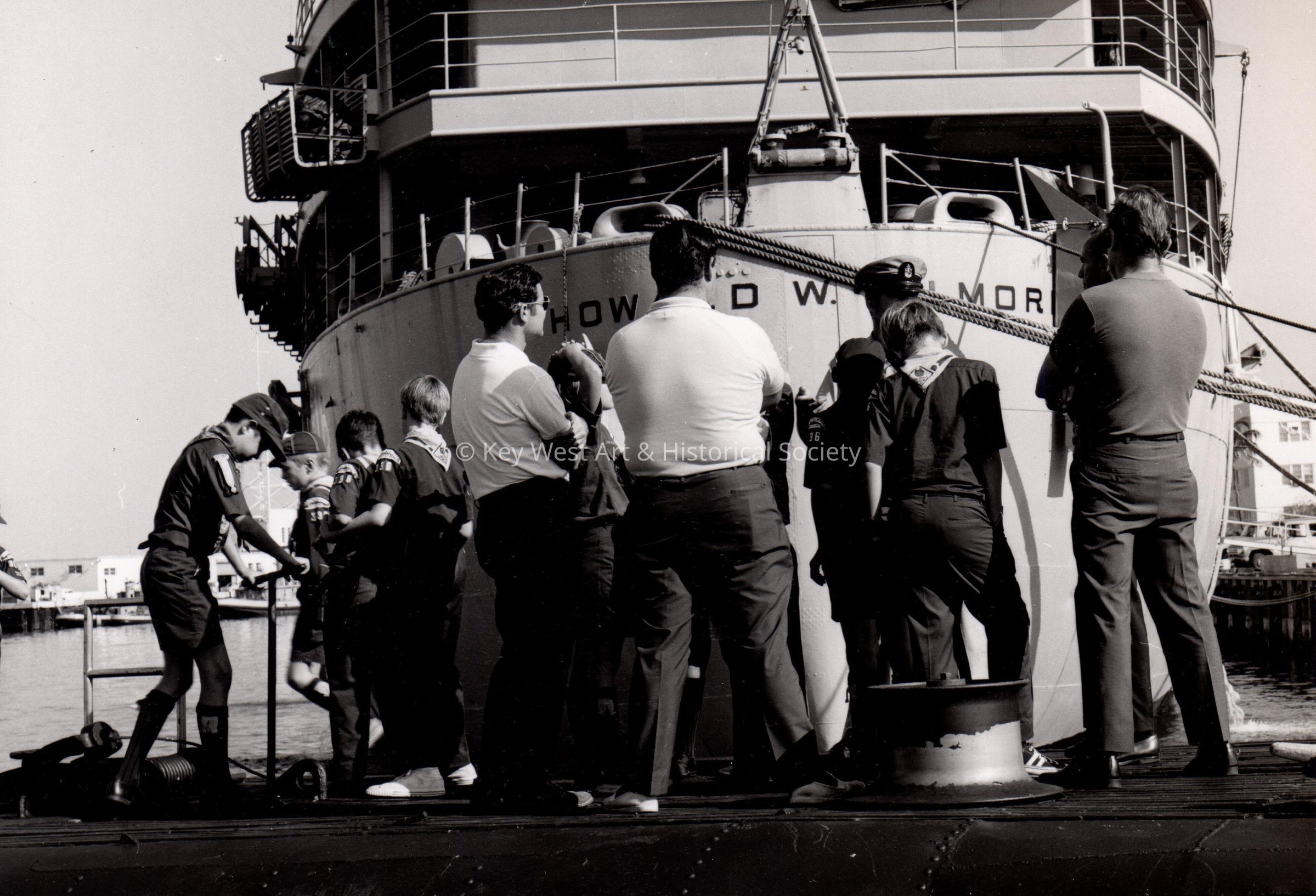 Black and white photograph of a group of Boy Scouts visiting an unknown U.S. Navy submarine at Naval Station Key West. The submarine USS Howard W. Gilmore (AS-16) in the background.
