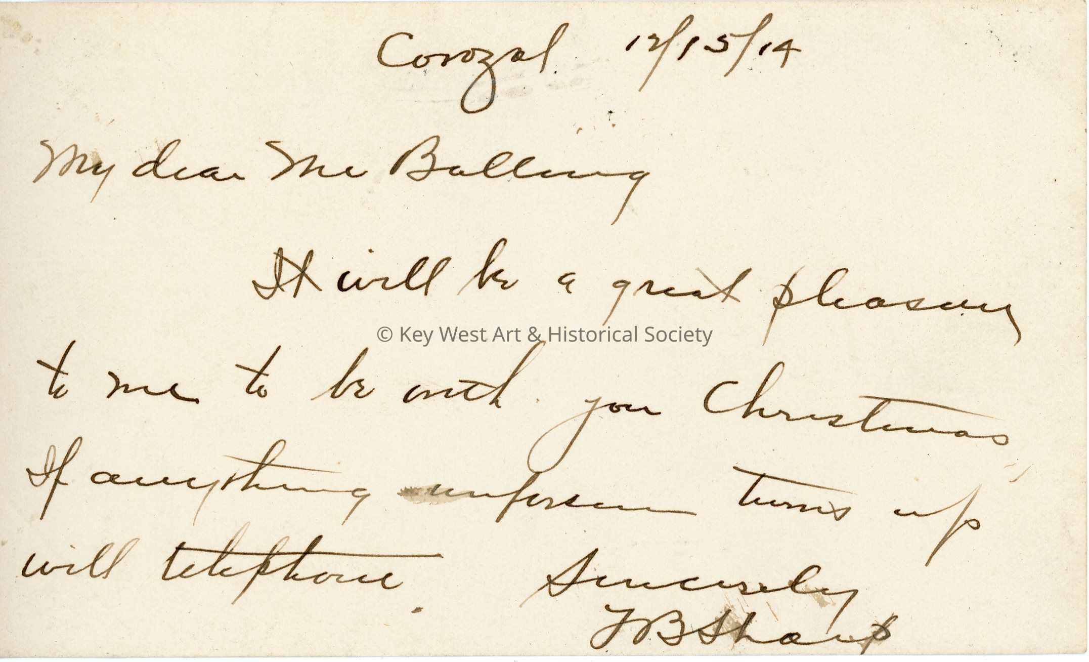 Corozal 12/15/14 / My dear Mr Balling / It will be a great pleasure to me to be with you Christmas if anything unforseen turns up will telephone. / Sincerely / JB SharpLanguage