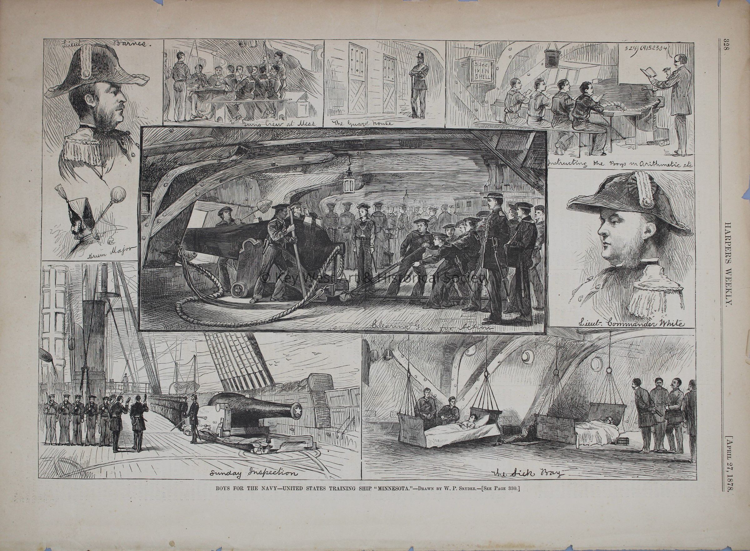 Magazine clipping from Harper's Weekly with black and white drawings by W.P. Snyder titled 'BOYS OF THE NAVY - UNITED STATES TRAINING SHIP "MINNESOTA."' The drawings depict life aboard the training ship USS MINNESOTA including activities such as Sunday inspections and arithmetic lessons.Collection