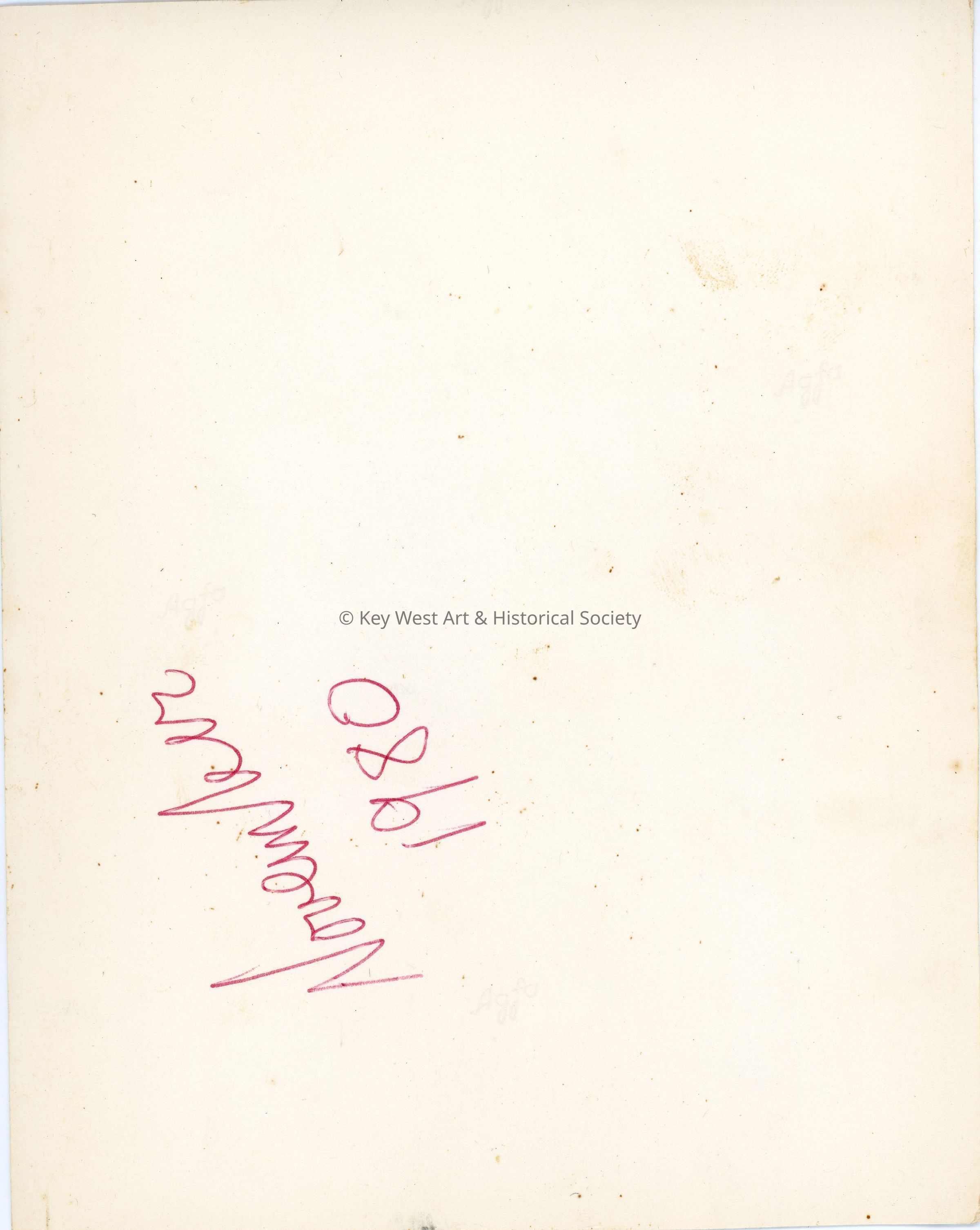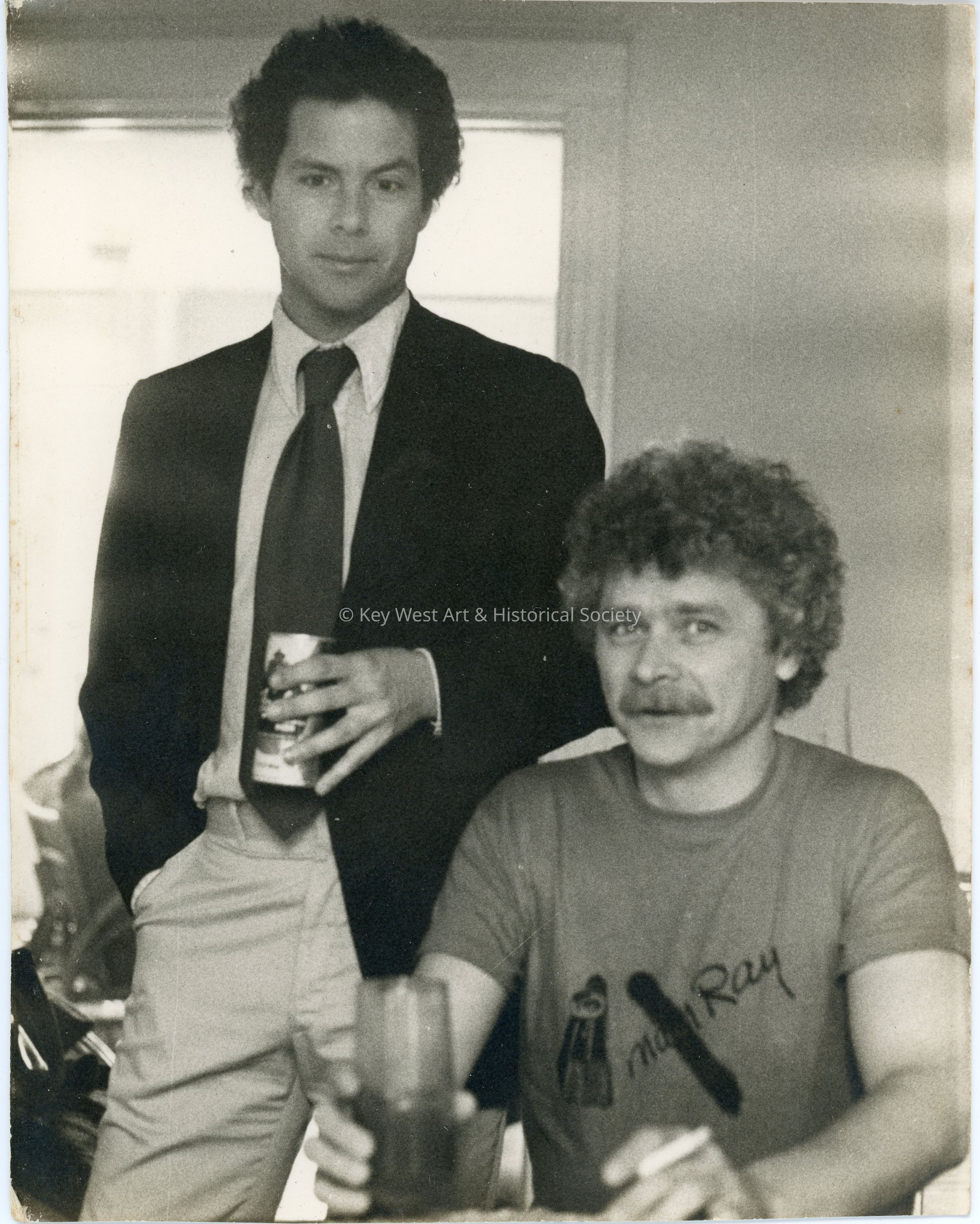 Black and white matte photograph of Brewster Chamberlin (seated) and an unknown man (standing). Both are holding a drink. The back of the photograph has 'November 1980' written in red ink.