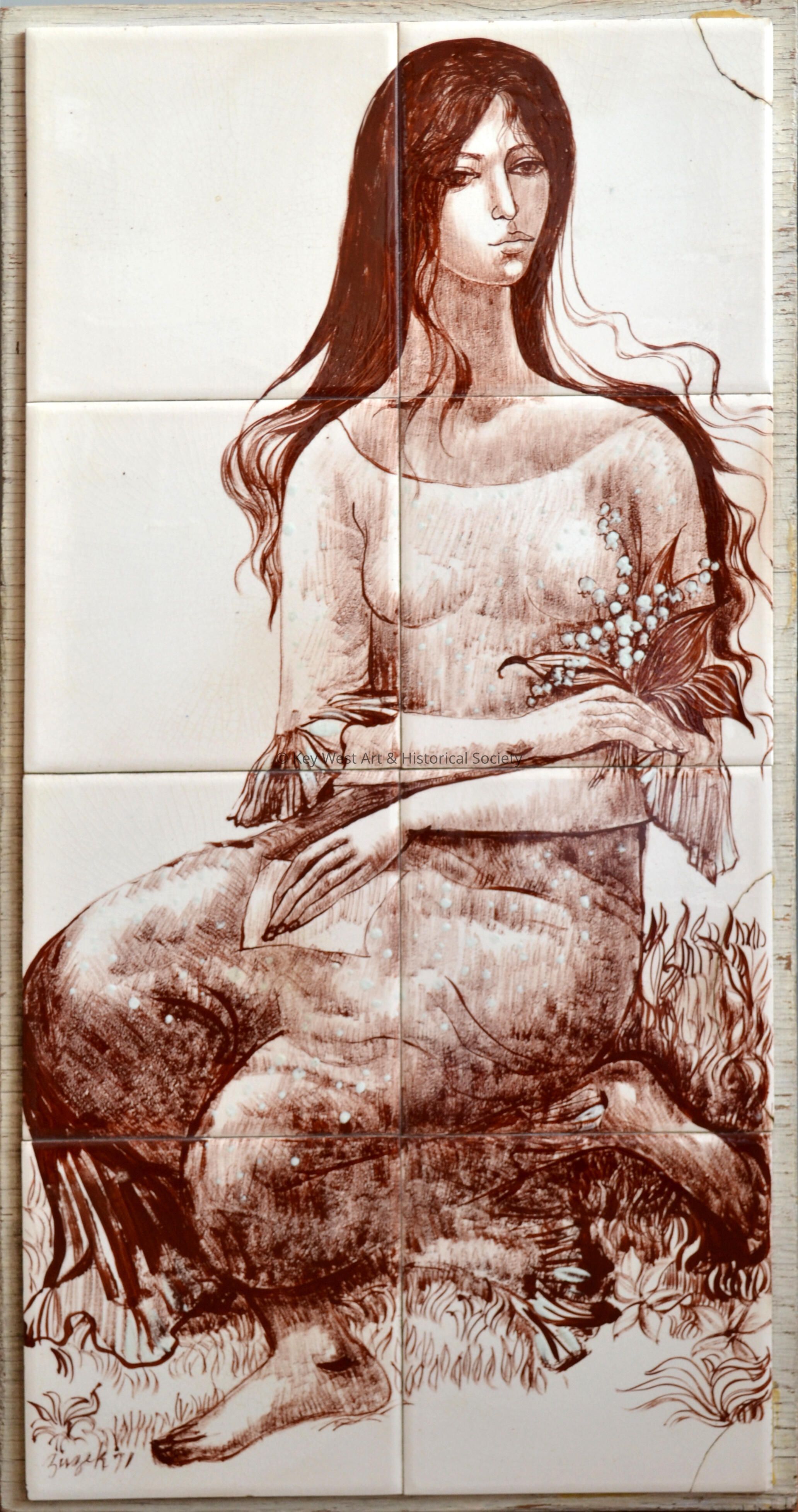 Tile on plywood artwork by Suzie dePoo depicting a bride kneeling with lily of the valley in her hand. The artwork is composed of eight 6"x6" tiles.Artwork Details