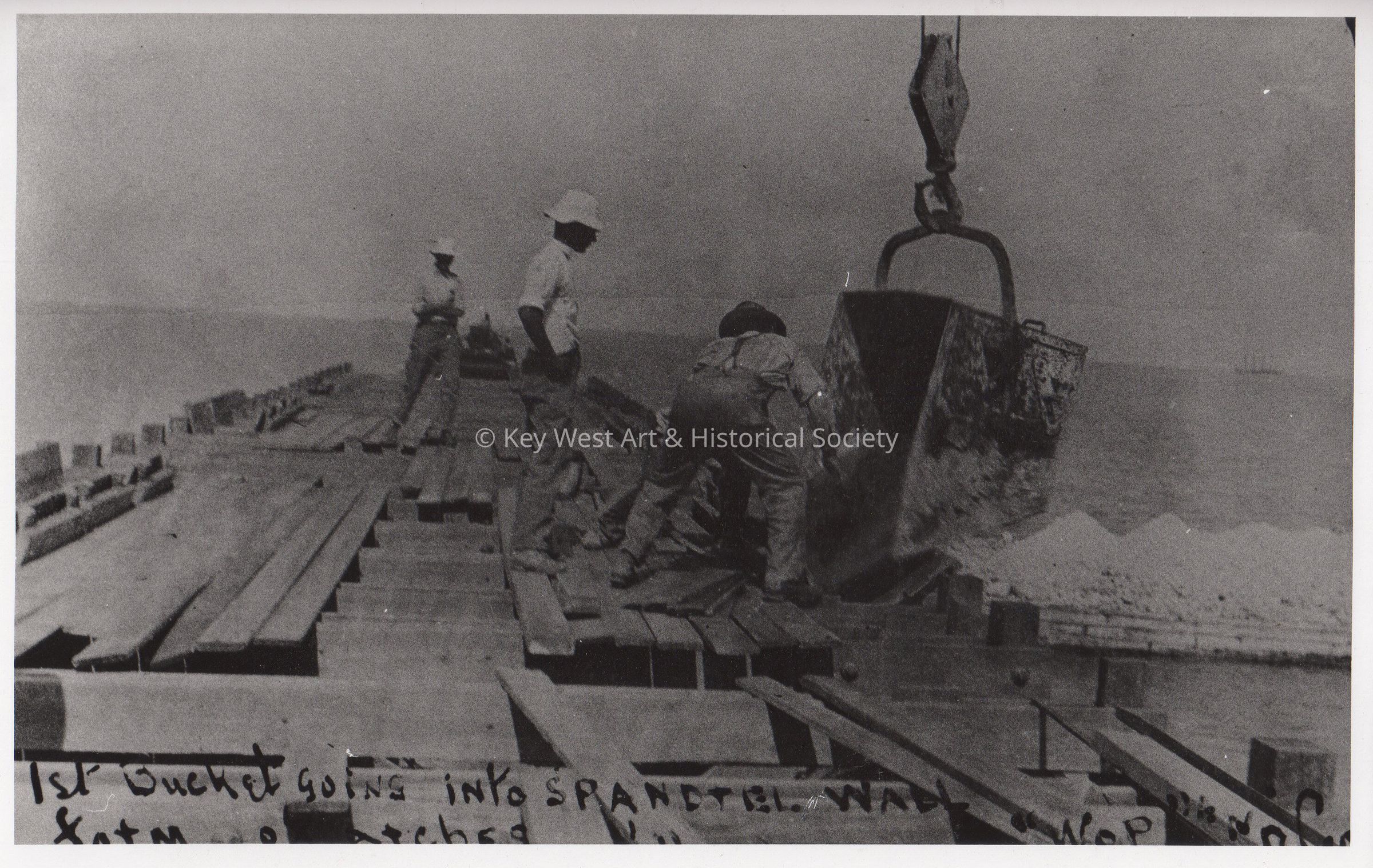 Black and white photograph of men working on a bridge belonging to the Overseas Railway. Possibly Long Key Bridge or Seven Mile Bridge.