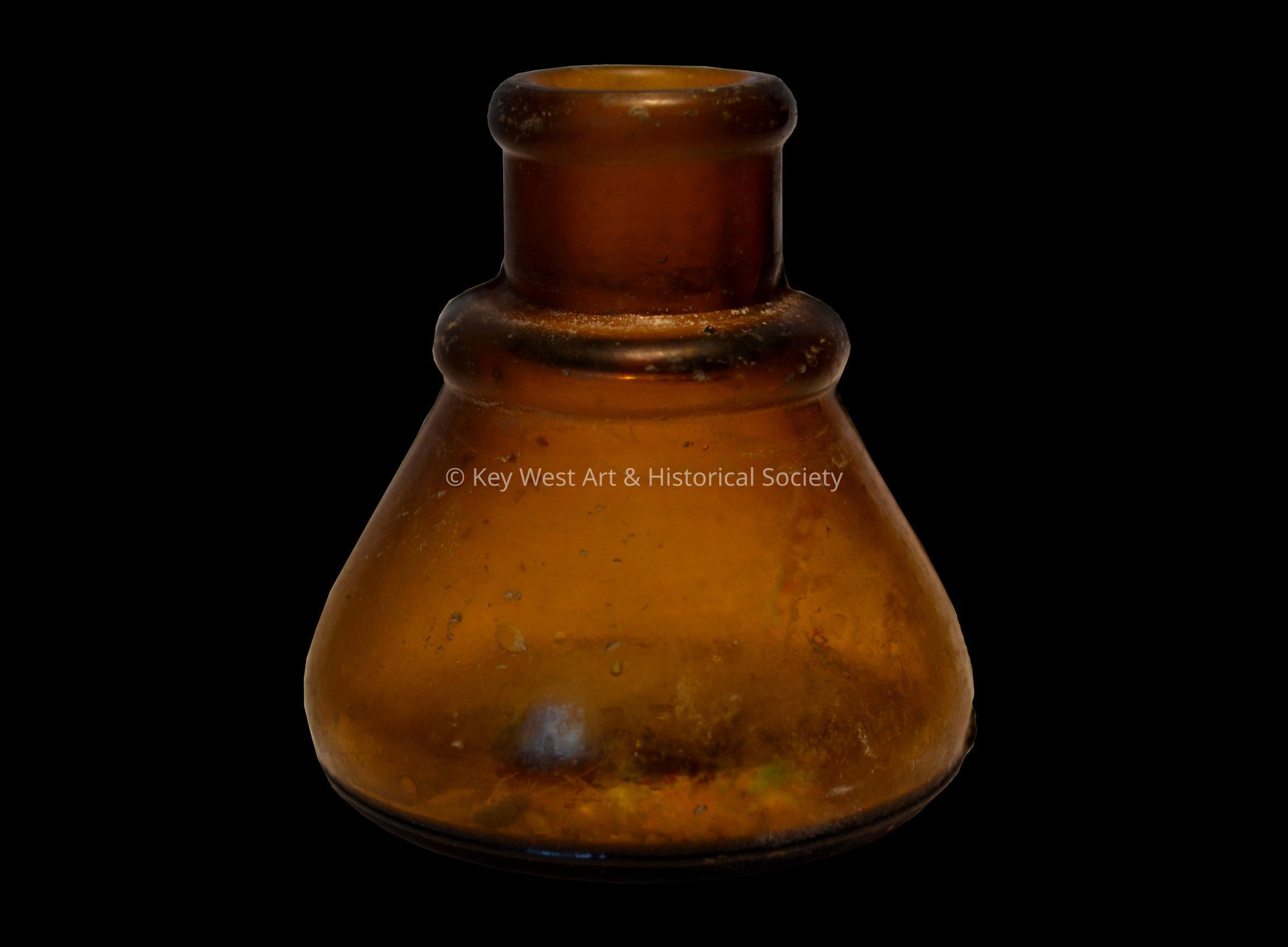 Brown glass ink bottle with no embossing and no top. The bottle was originally excavated by the donor's mother, Grace Curlee, during the restoration of Fort Zachary Taylor in the 1960s.Collection