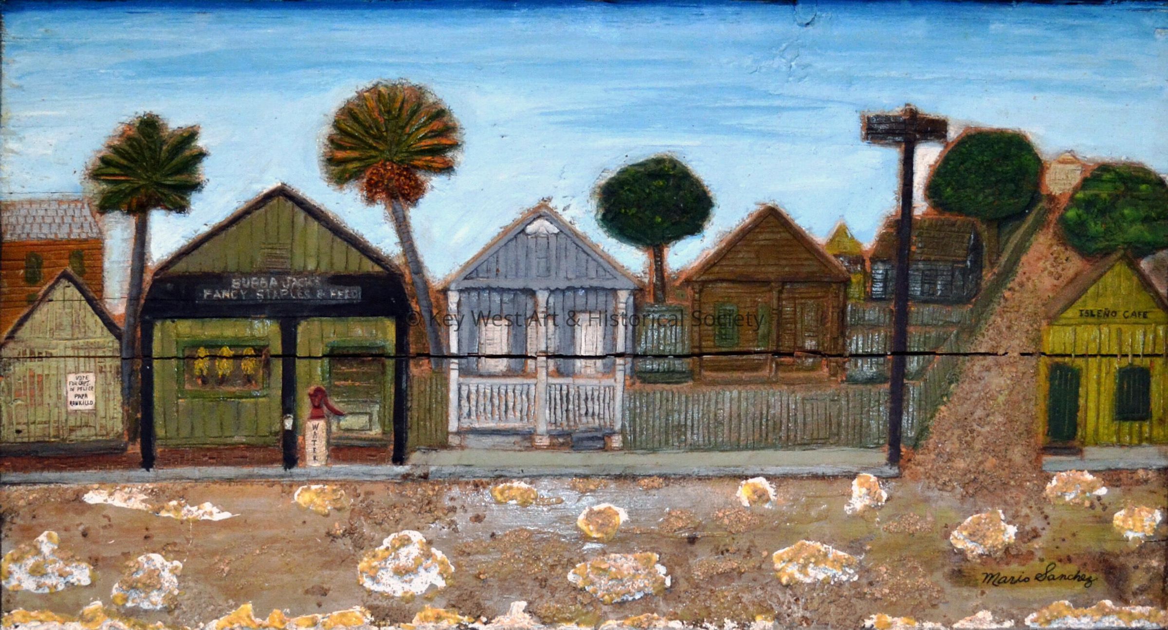 Wood carving by Mario Sanchez depicting a Key West street featuring Bubba Jack's Fancy Staples store and the Isleno Cafe.