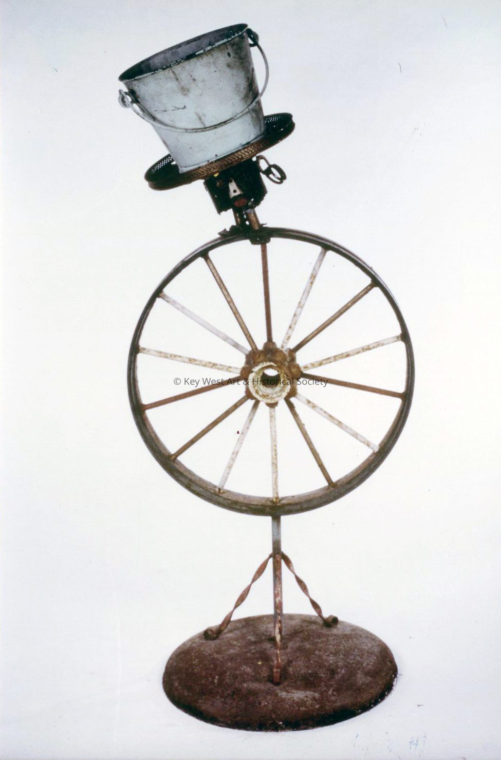 Freestanding sculpture by Stanly Papio depicting a human-like figure. The body is whose body is made from a wagon wheel mounted on a 1' diameter steep pipe with three twisted wrought iron props at base. Head and both sections that make up hat move independently. That is made from a bucket and includes a movable handle and a round tray.Type of Sculpture