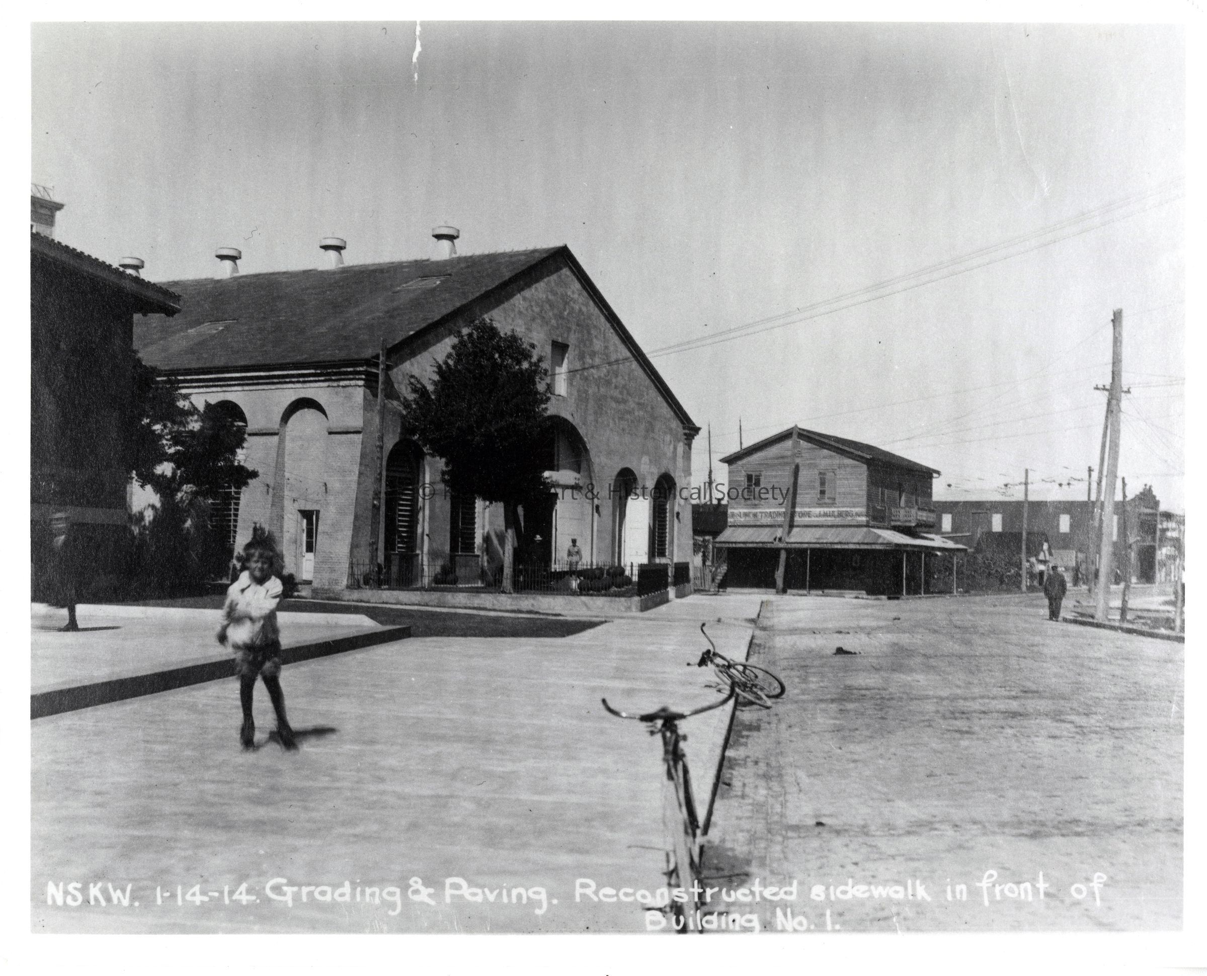 Black and white photograph of Naval Station Key West Building No. 1 at 291 Front Street. Caption on the photograph reads, 'Grading and Paving. Reconstructed sidewalk in front of Building No. 1.'
