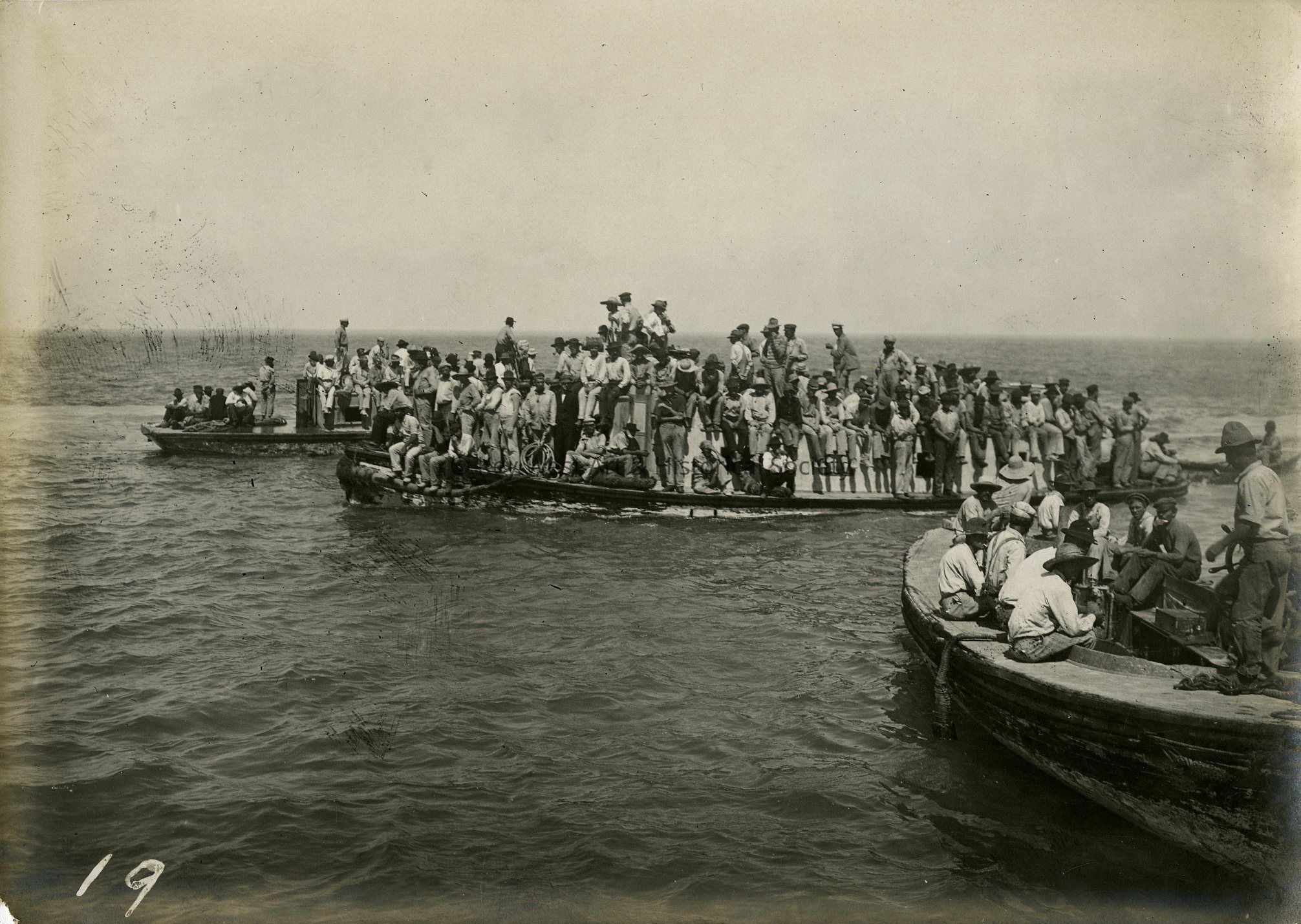 Black and white photograph depicting the construction of the Oversea Railway. Construction workers at Long Key Viaduct returning to work after lunch.