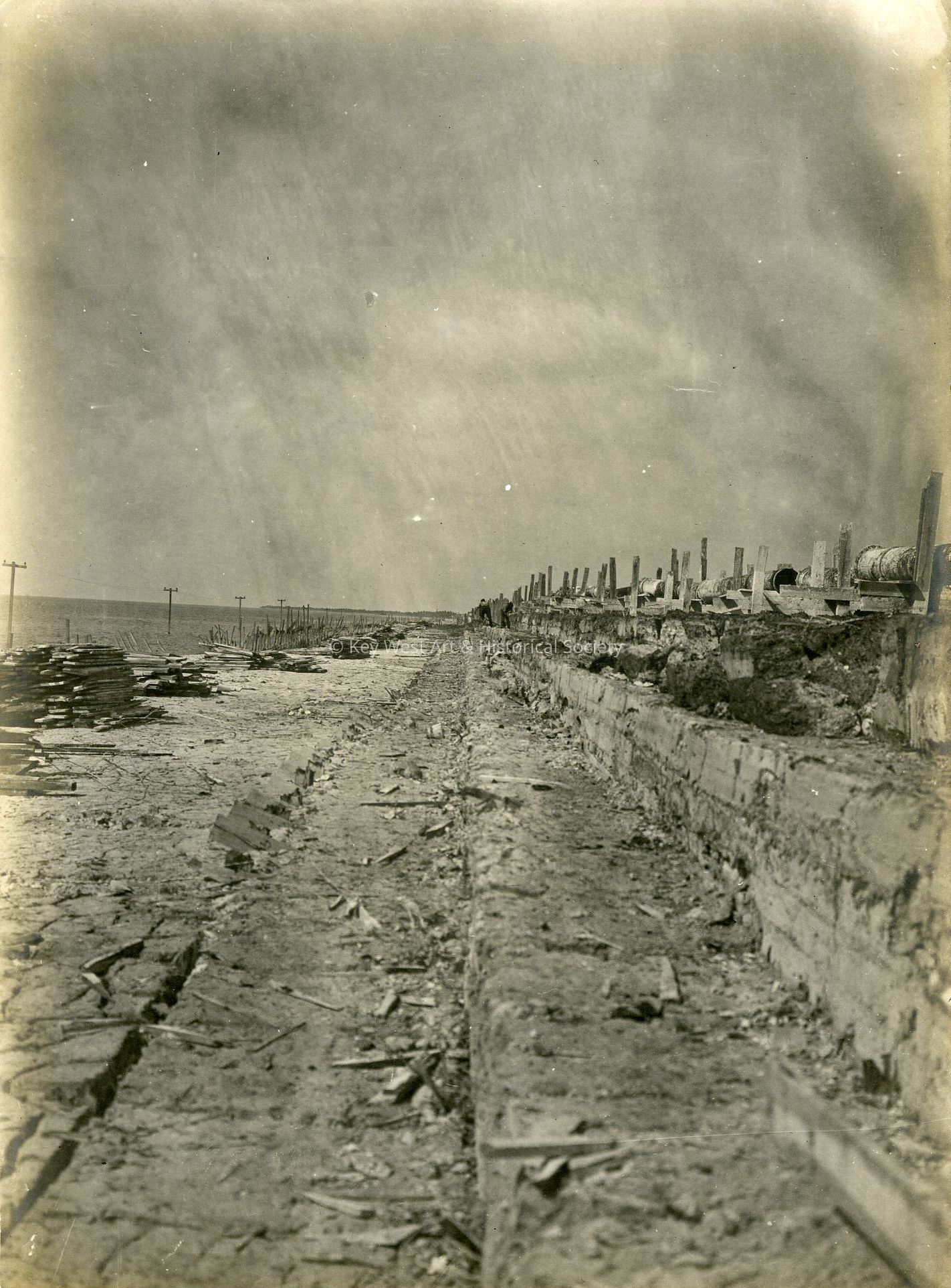 Black and white photograph depicting the construction of the Oversea Railway. The image shows a shoreline with over water power lines.
