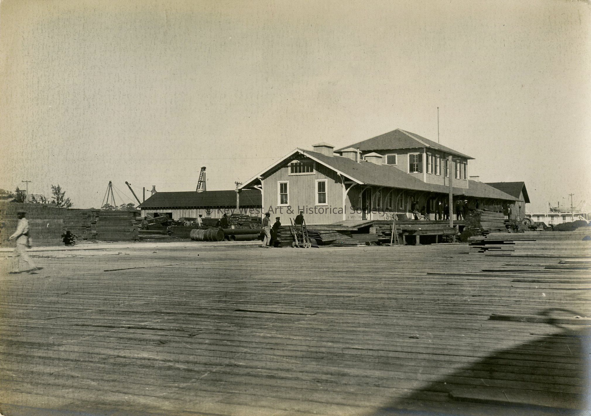 Black and white photograph depicting the construction of the Oversea Railway. The image shows a train depot and boardwalk under construction, possibly at Marathon.