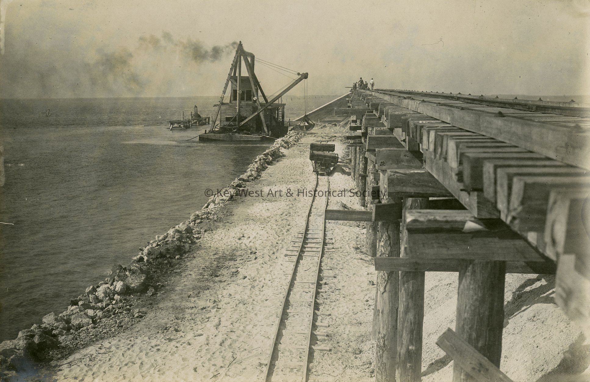 Black and white photograph depicting the construction of the Oversea Railway. The image shows a floating crane moving earth and marl beneath the train tracks.