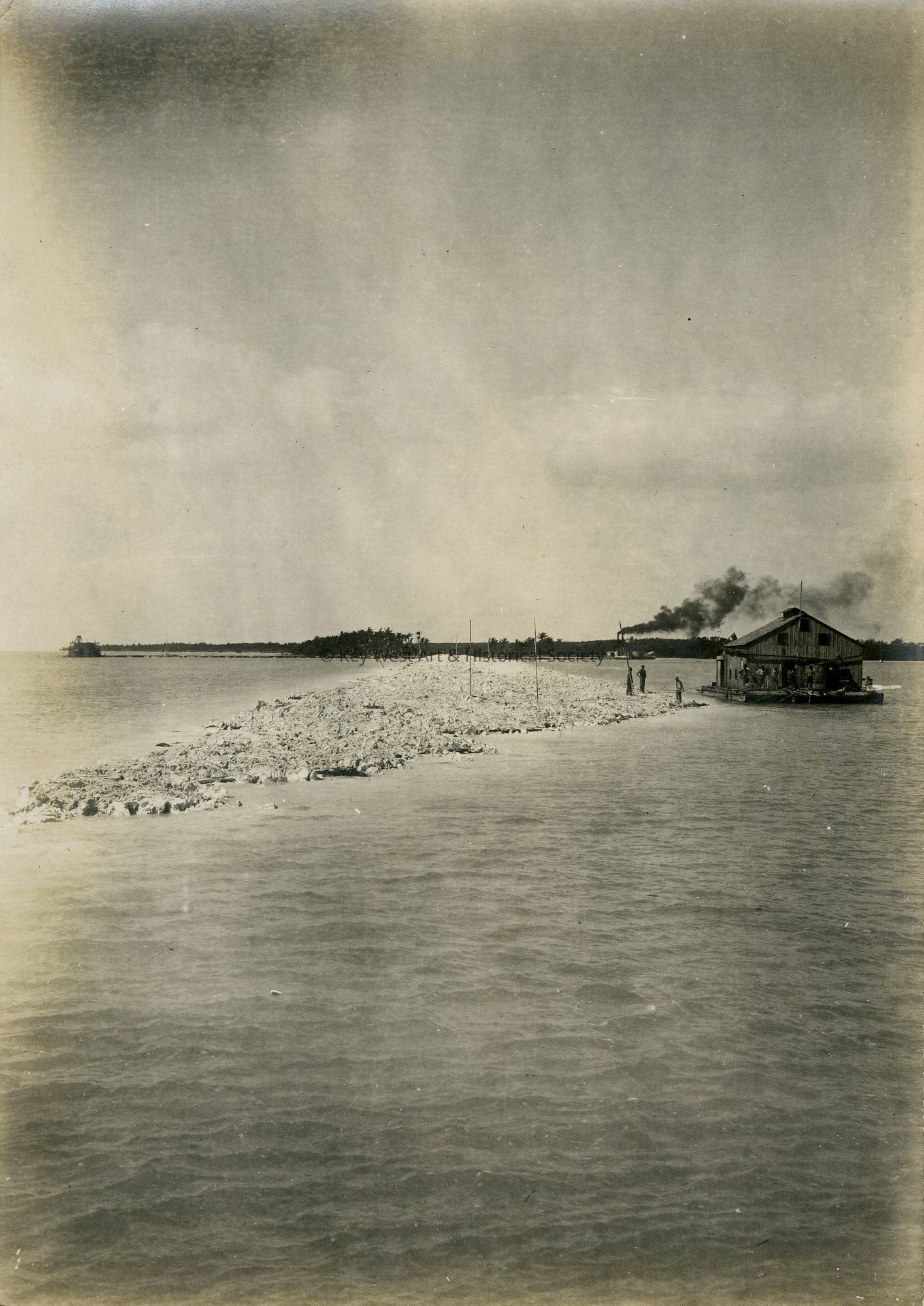 Black and white photograph depicting the construction of the Oversea Railway. The image shows a floating construction building along a spit of filled in earth.