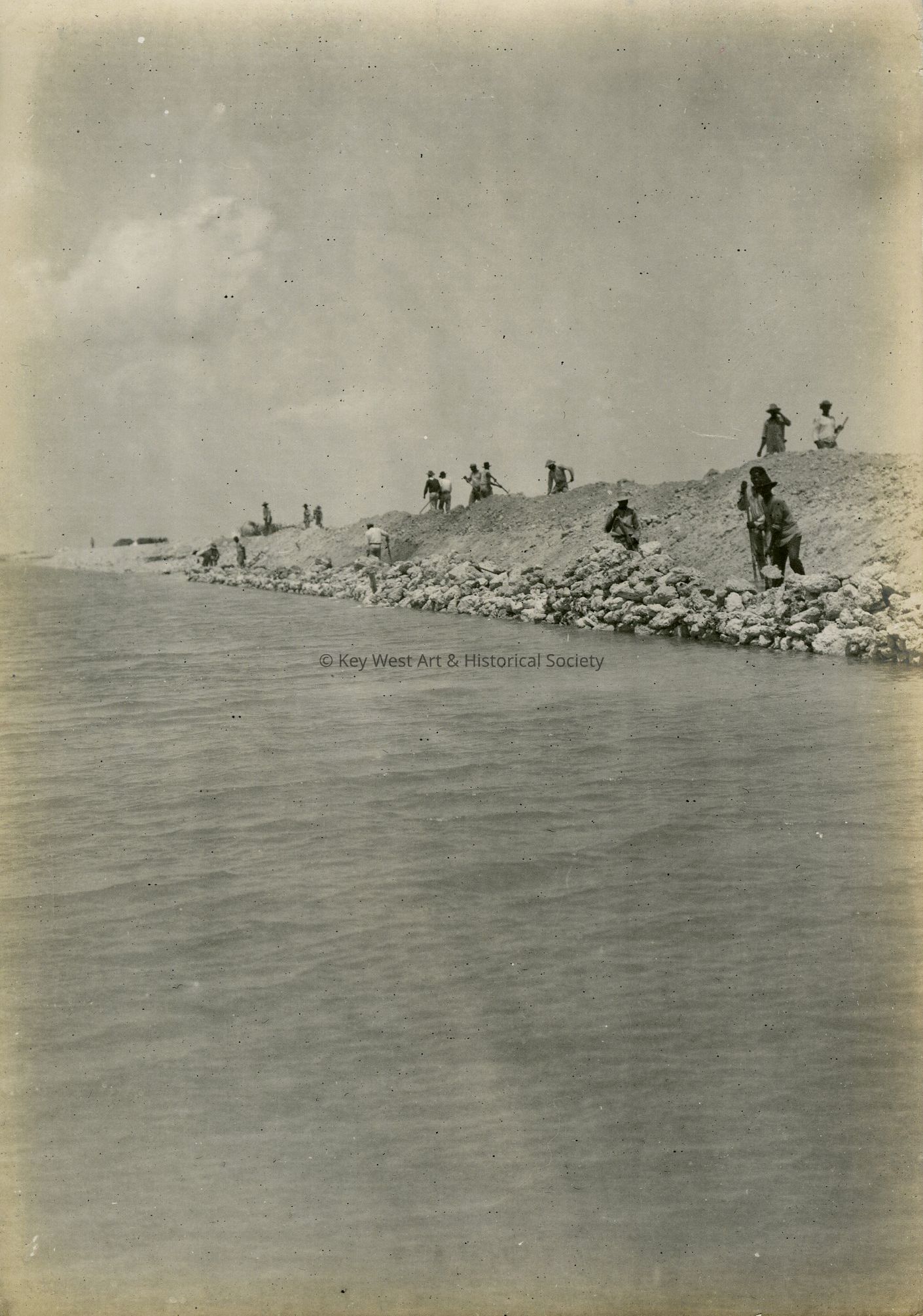 Black and white photograph depicting the construction of the Oversea Railway. The image shows construction workers moving rock, marl and earth to create a railroad bed.