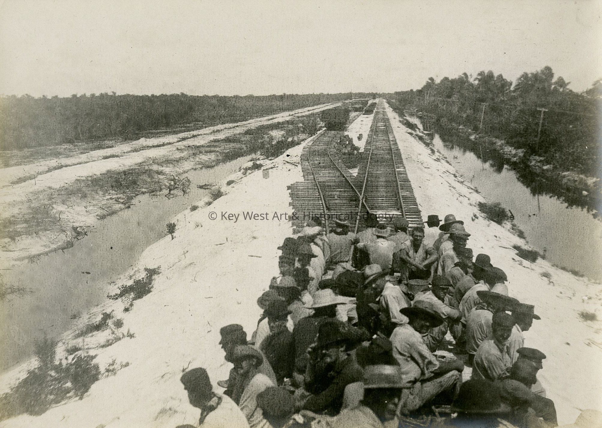 Black and white photograph depicting the construction of the Oversea Railway. The image shows construction workers receiving a delivery of siding on Lower Matecumbe.