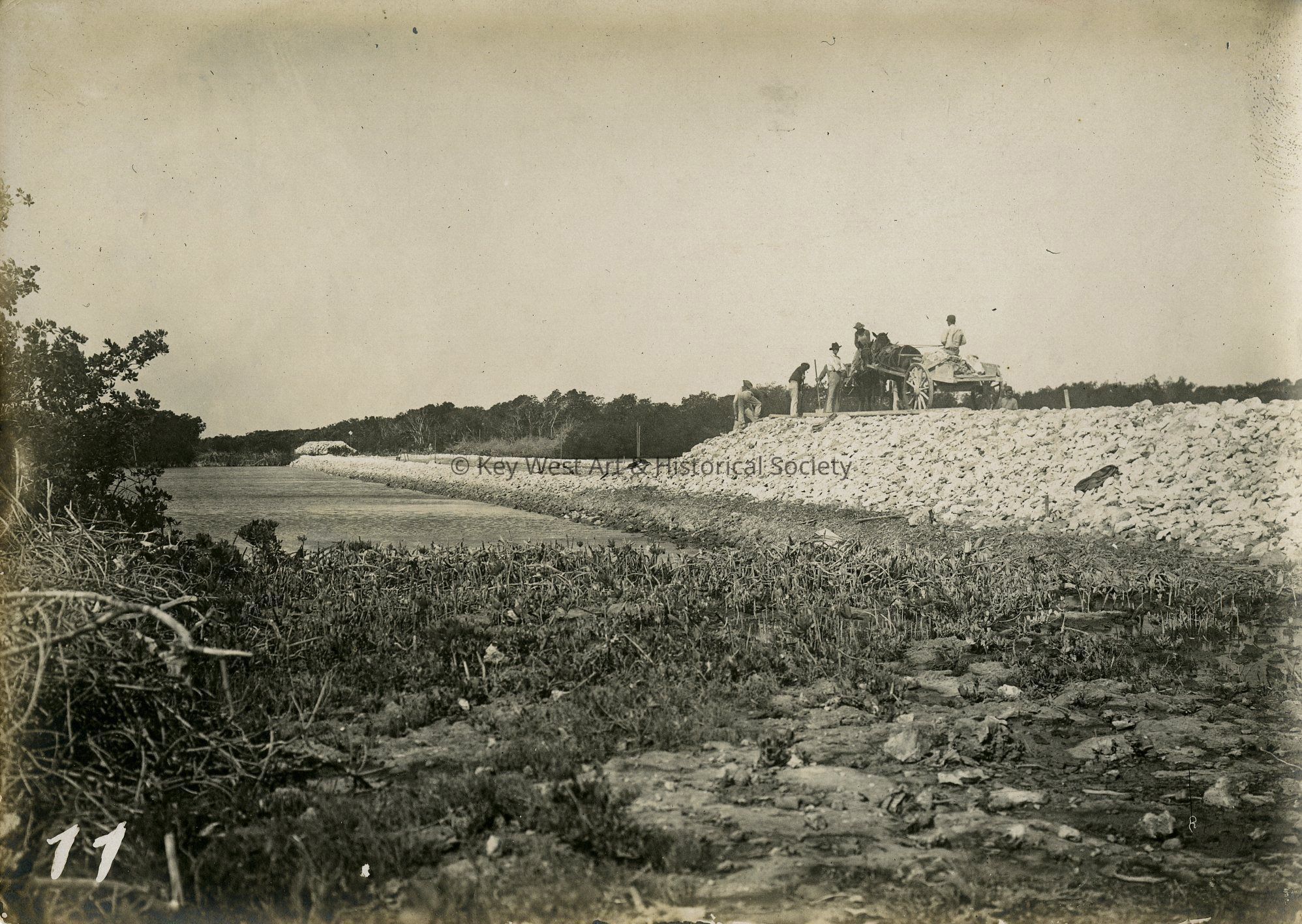 Black and white photograph depicting the construction of the Oversea Railway. Construction workers are creating an elevated rail bed in the Upper Keys.