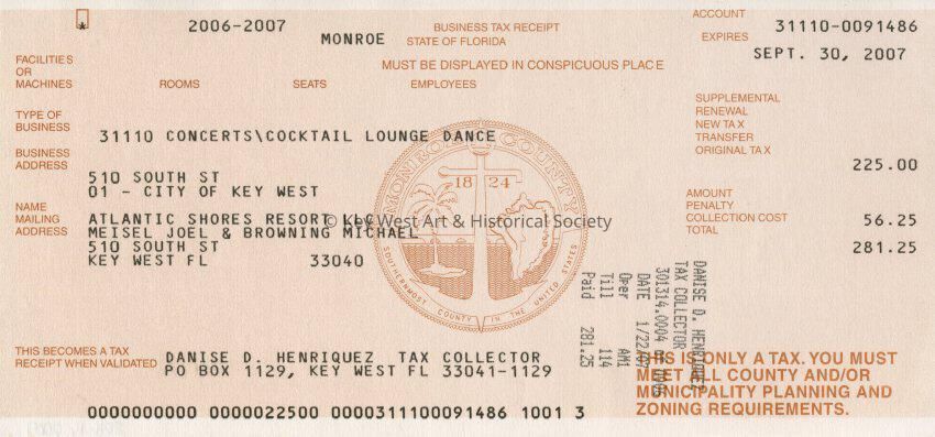 Business Tax Receipt for Atlantic Shores Resort at 510 South Street for concerts and lounge dancing effective January 22, 2007, issued by the Monroe County Tax Collectors office.Collection