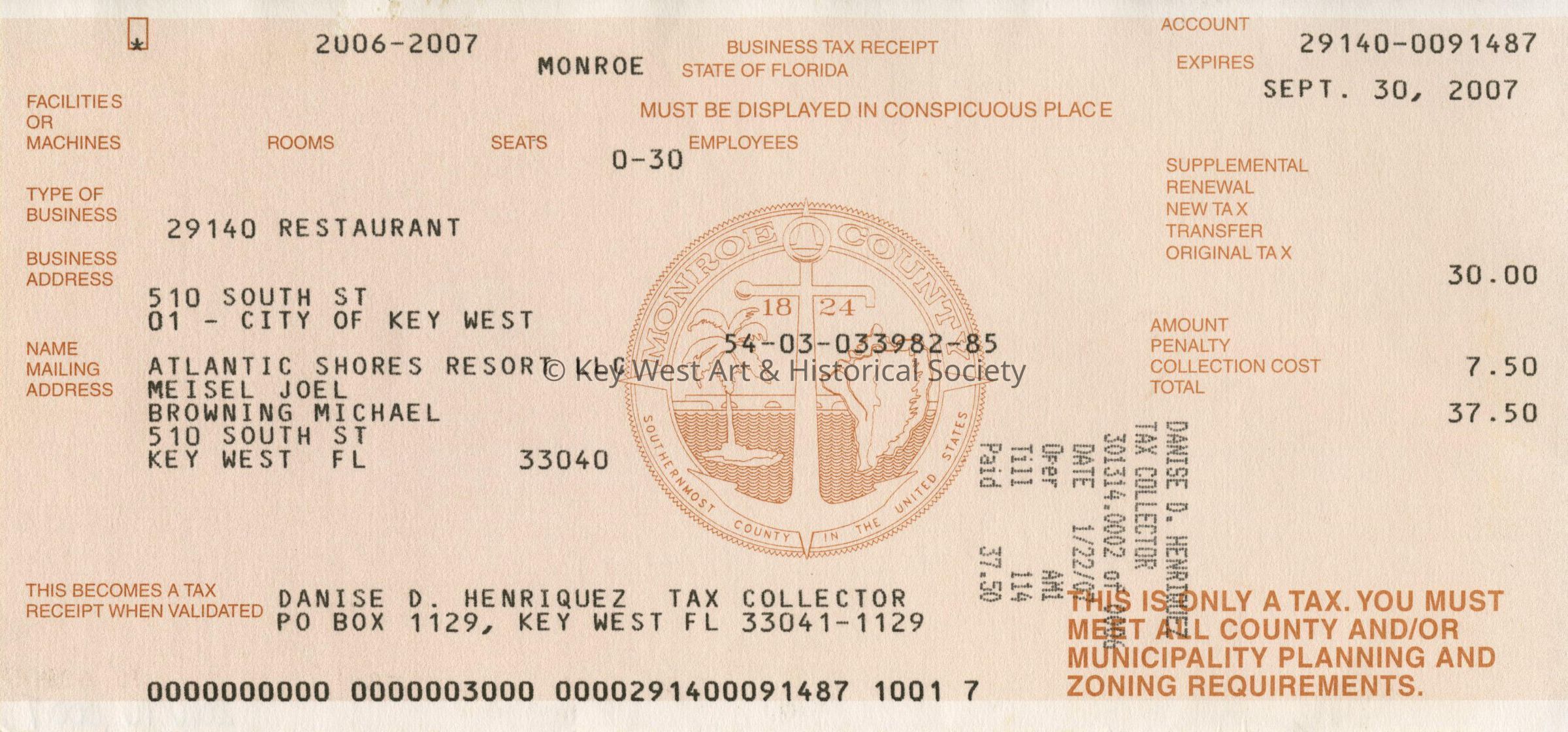 Business Tax Receipt for Atlantic Shores Resort at 510 South Street effective January 22, 2007, issued by the Monroe County Tax Collectors office.Collection
